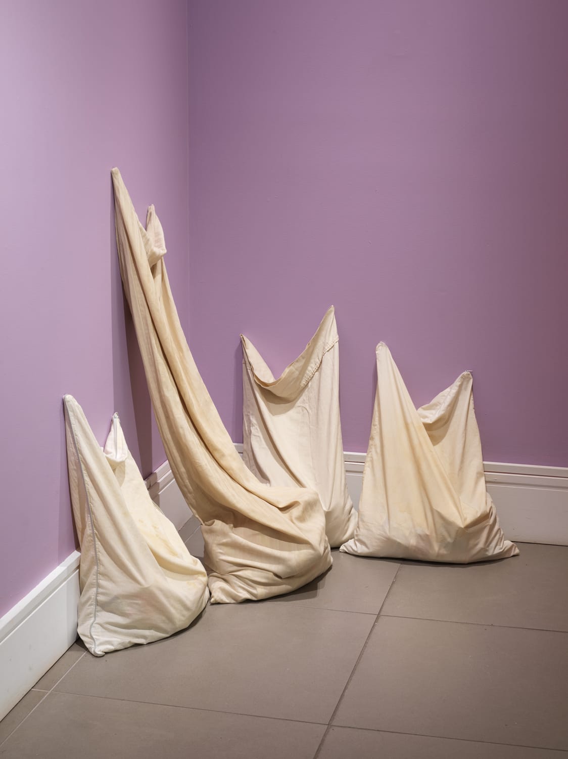 Alex Dolores Salerno’s “Pillow Fight” (2019) comments on visibility and equity in the healthcare system, considering which populations are deemed worthy of care and the implications of tying health care to employment, as it is in the US. In the work, four stained pillowcases hide medical paraphernalia belonging to the artist and their friends. The installation also confronts the assumptions that healthy bodies are the norm and that illness is an aberration to conceal.