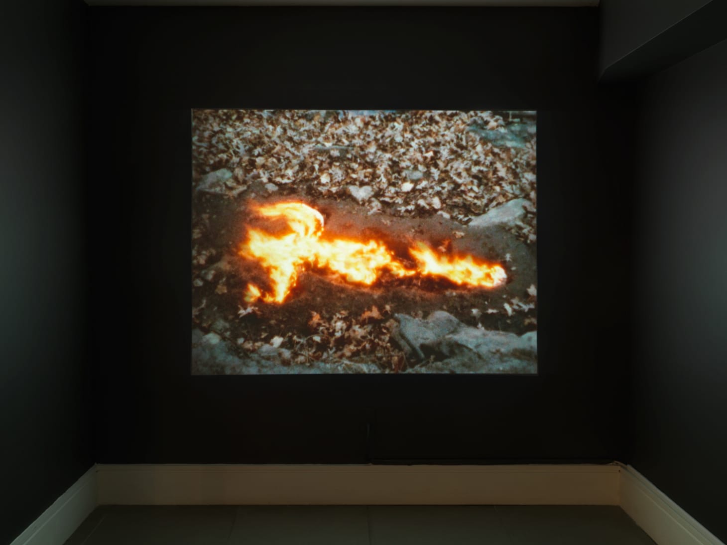 The curatorial decision to tuck “Pillow Fight” into a corner by the base of the stairs augments its invisibility while encouraging viewers to take stock of their own sight lines. The installation is one of two to reference iconic works by Felix Gonzalez-Torres — “Untitled (Billboard for an empty bed)” and “Untitled (Perfect Lovers)” (both 1991) — and his efforts to make AIDS visible. Throughout the exhibition, works by emerging and established artists reflect and respond to one another: Chun’s “Blueprints” are installed by Jenny Holzer’s minimalist painting of redacted government reports, while Tamayo’s “A▮ANA” is complemented by a Super-8mm film by Mendieta, “Silueta de Arena” (1978).