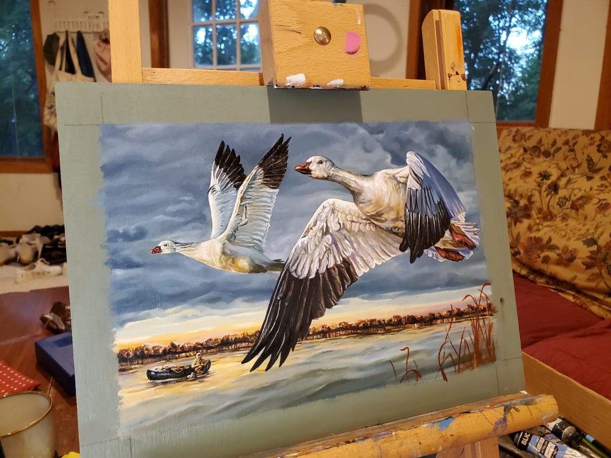 For her submission, Fennell chose to depict two Ross’s Gooses flying over a lake while a hunter on a boat is preparing decoys in the background. "I like their white feathers in the sun," she said, explaining her preference.