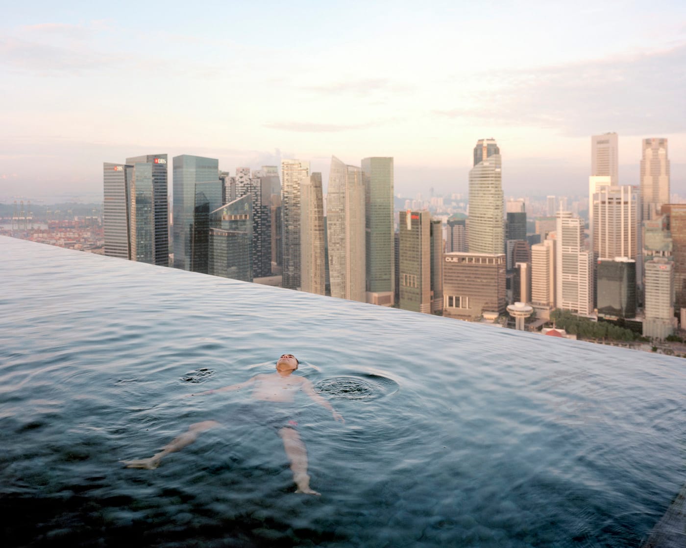 Paolo Woods and Gabriele Galimberti, “Man floating in the 57th-floor swimming pool of the Marina Bay Sands Hotel in Singapore’s financial district” (2015), photograph (courtesy the artists)