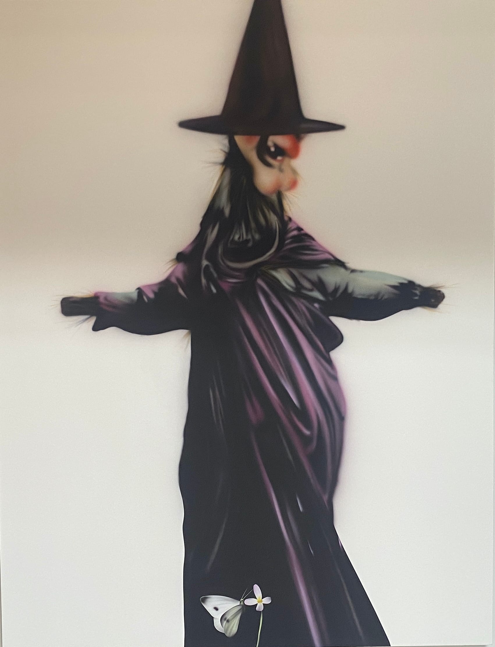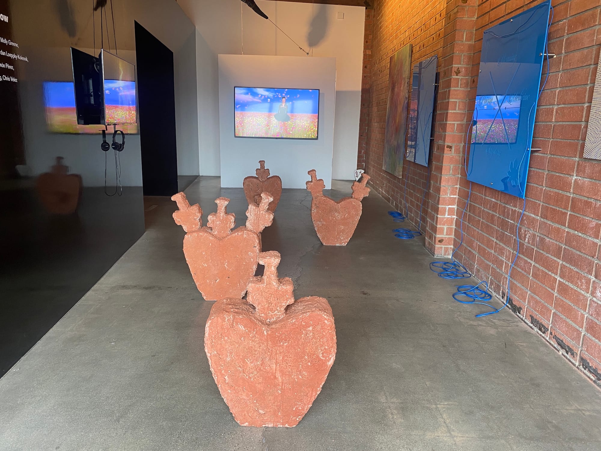 For example, Aaron Elvis Jupin’s “Natures Guard Dog (Saviors)” (2023) is an acrylic depiction of a witch-like figure with scarecrow arms. At its knees is a little white butterfly. And scattered throughout the gallery are untitled concrete pieces by Star Feliz, which they refer to as “Floor maps, or Portals into emerging mysteries.” The concrete is pulled from a sidewalk in ruins, and they show symbols reminiscent of esoteric spirals and arrows. I wanted a little more curatorial guidance to link these works with the notion of glitches, but I found myself thinking that these connections in the fabric of space and time suggest that a reconnection with the spiritual world is part and parcel of reuniting with, rather than extracting from, natural forces.