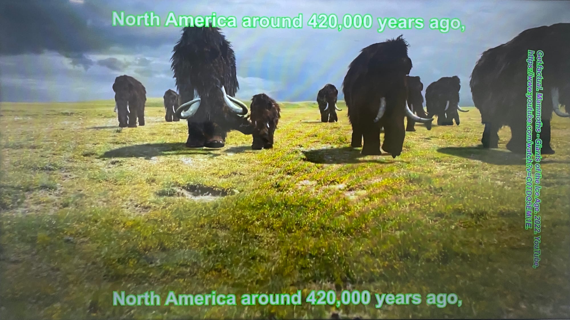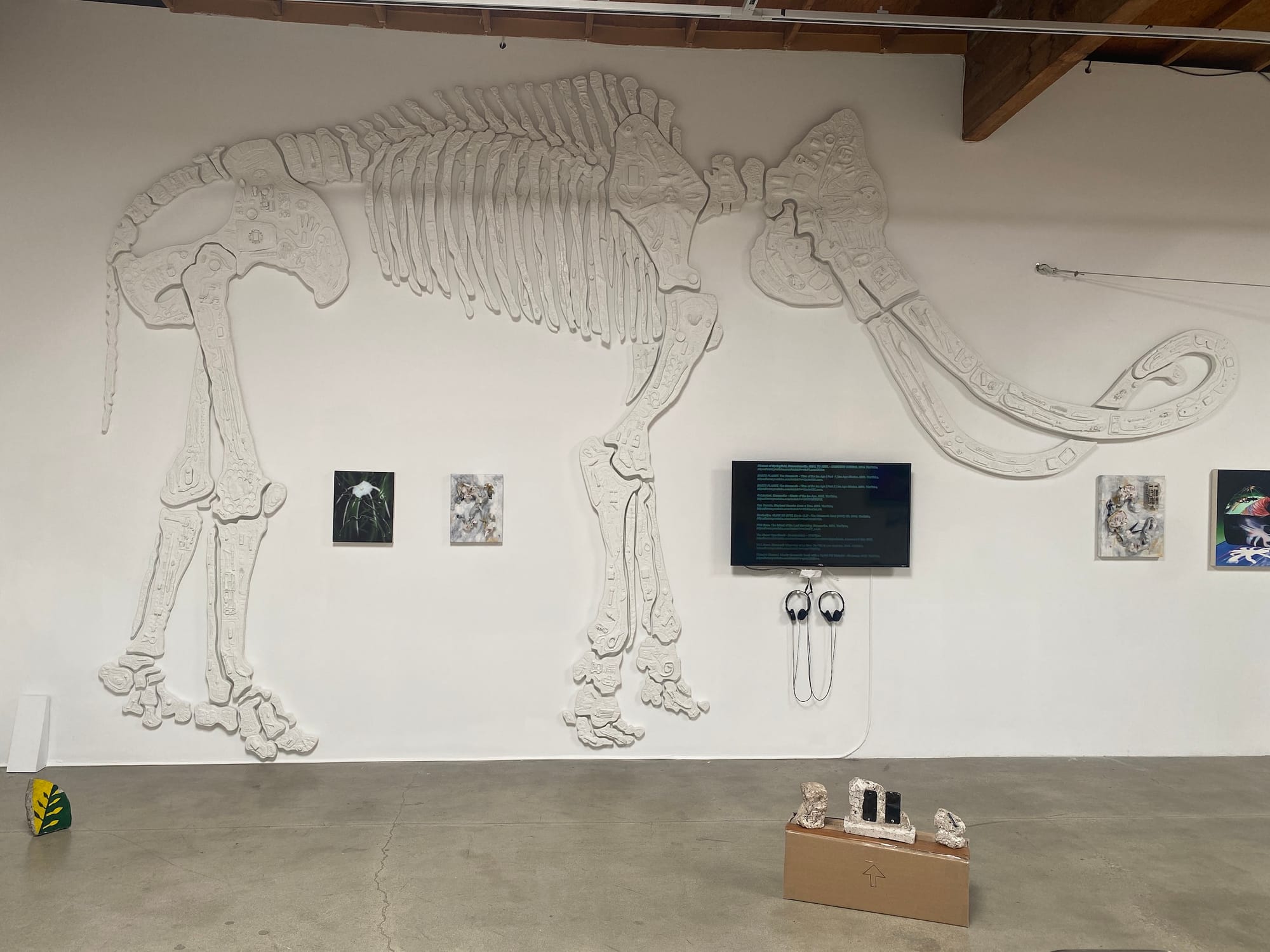 Glitch ecology appears in Don Edler’s “Untitled (mammoth video)” (2022) an AI-generated video piece nestled within “the mammoth in the room (Zed)” (2021–22) a massive, impressive skeleton composed of plywood, Styrofoam, used batteries, and other detritus. Zed is a beloved mammoth unearthed in Los Angeles’s La Brea Tar Pits. He appears in the video, where we also learn about a theory that wooly mammoth hunting by humans may have contributed to climate change at the end of the Ice Age. As the theory goes, dwarf birch trees flourished with the demise of mammoths, darkening the reflective surface of the land around the Arctic. While some recent research holds that human hunting likely had a much smaller effect on mammoth extinction, what’s clear is that the extinction event accelerated ecosystem change.