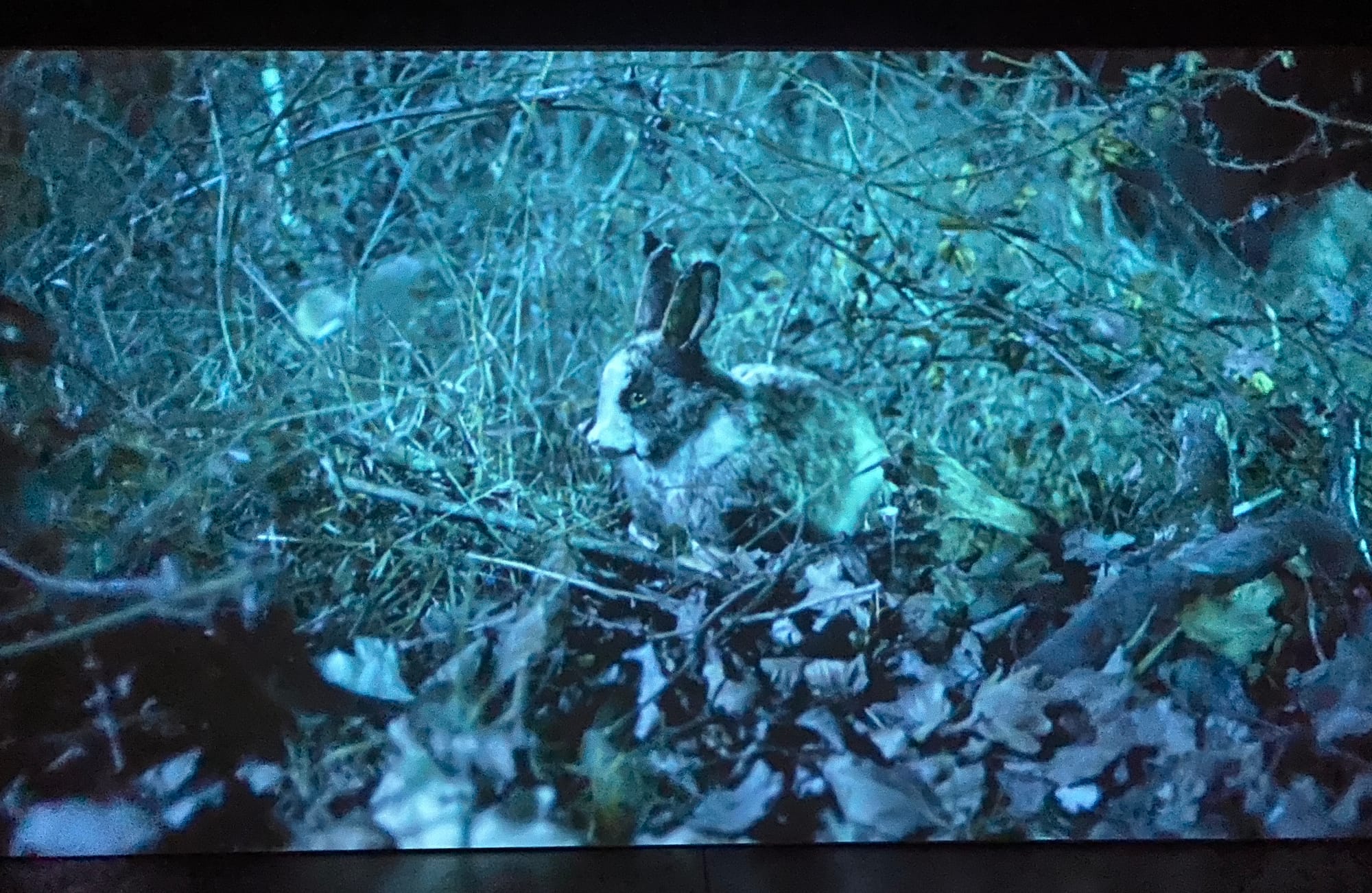 Andro Eradze’s “Raised in the Dust” (2022) which was part of 2022’s Venice Biennale, occupies a video room of its own. In the film, fireworks erupt over a nondescript forest, and taxidermied creatures, like a wolf and a hare, peek out in the flashes of light. If this vision of apocalypse leaves little room for hope, Mimi Ọnụọha’s These Networks In Our Skin (2021) depicts four women rewriting information cables with hair and other objects, as they reimagine and revise how the internet is built from the ground up.
