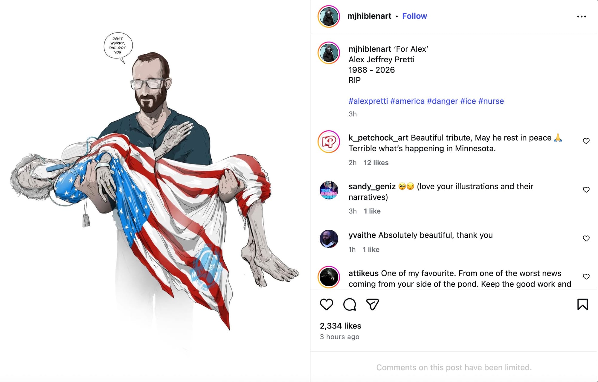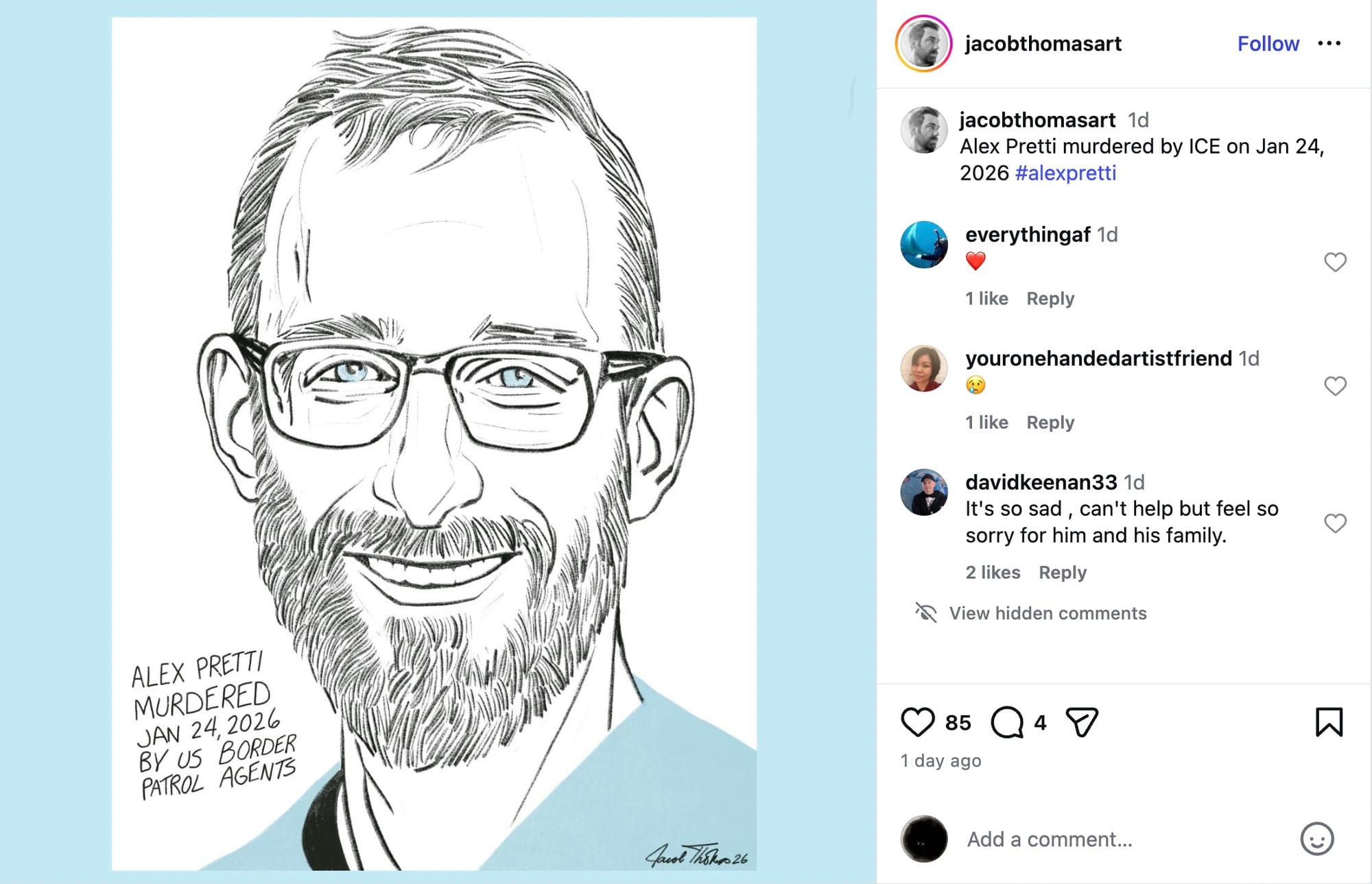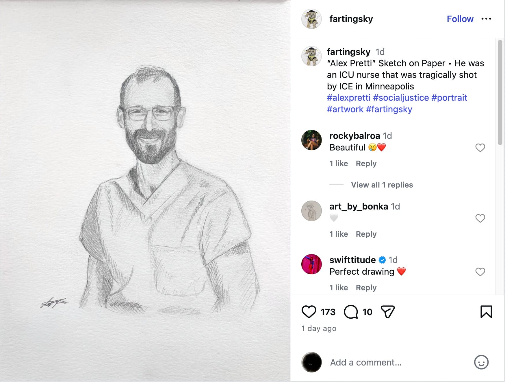 Horror-stricken artists and activists have shared his photo internationally at vigils, demonstrations, and online. Many artists were moved by a professional portrait of Pretti smiling in his sky-blue work scrubs, and responded quickly by capturing his likeness in tribute artworks honoring his life and work.