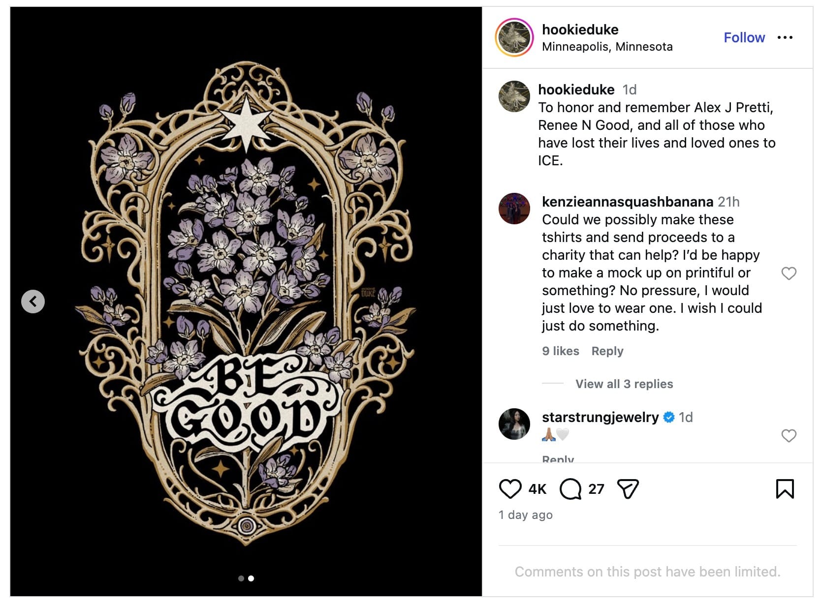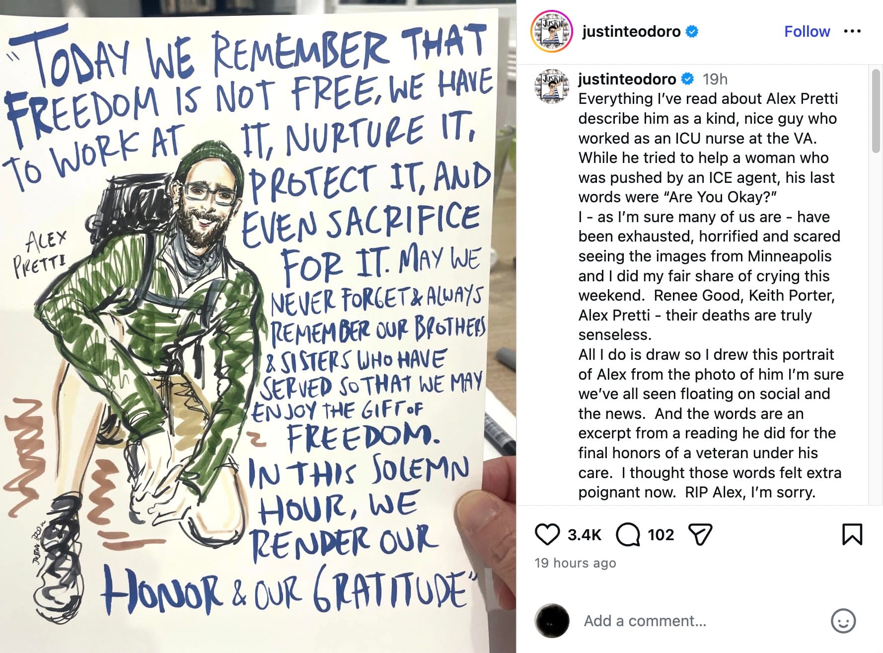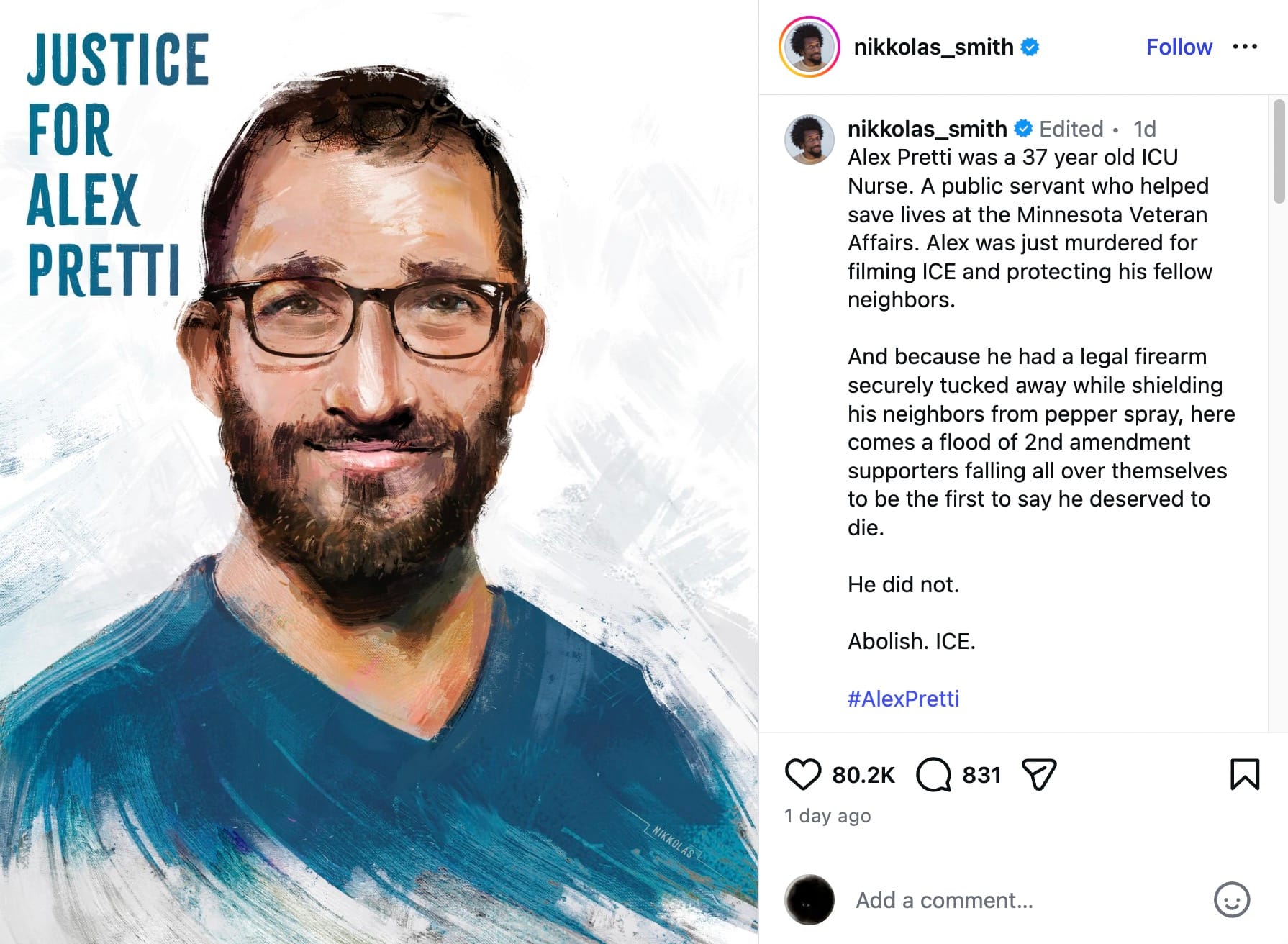 Horror-stricken artists and activists have shared his photo internationally at vigils, demonstrations, and online. Many artists were moved by a professional portrait of Pretti smiling in his sky-blue work scrubs, and responded quickly by capturing his likeness in tribute artworks honoring his life and work.