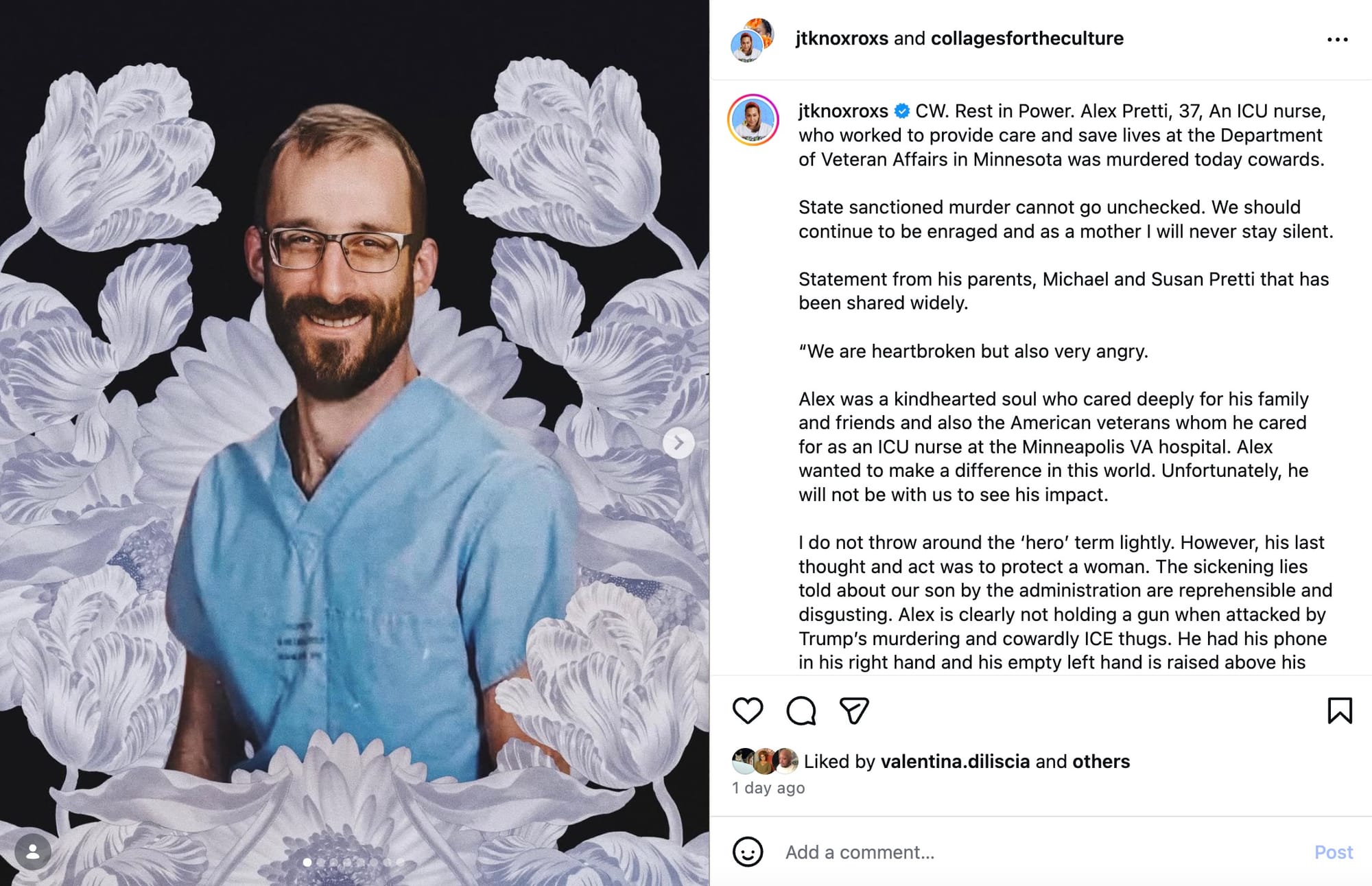 While many render and share Pretti's portrait in remembrance and solidarity, others look to his life and career symbolically — especially highlighting his surname and that of Good's. One collage artist took a photo of Pretti in his workplace and nestled him in a bouquet of flowers.