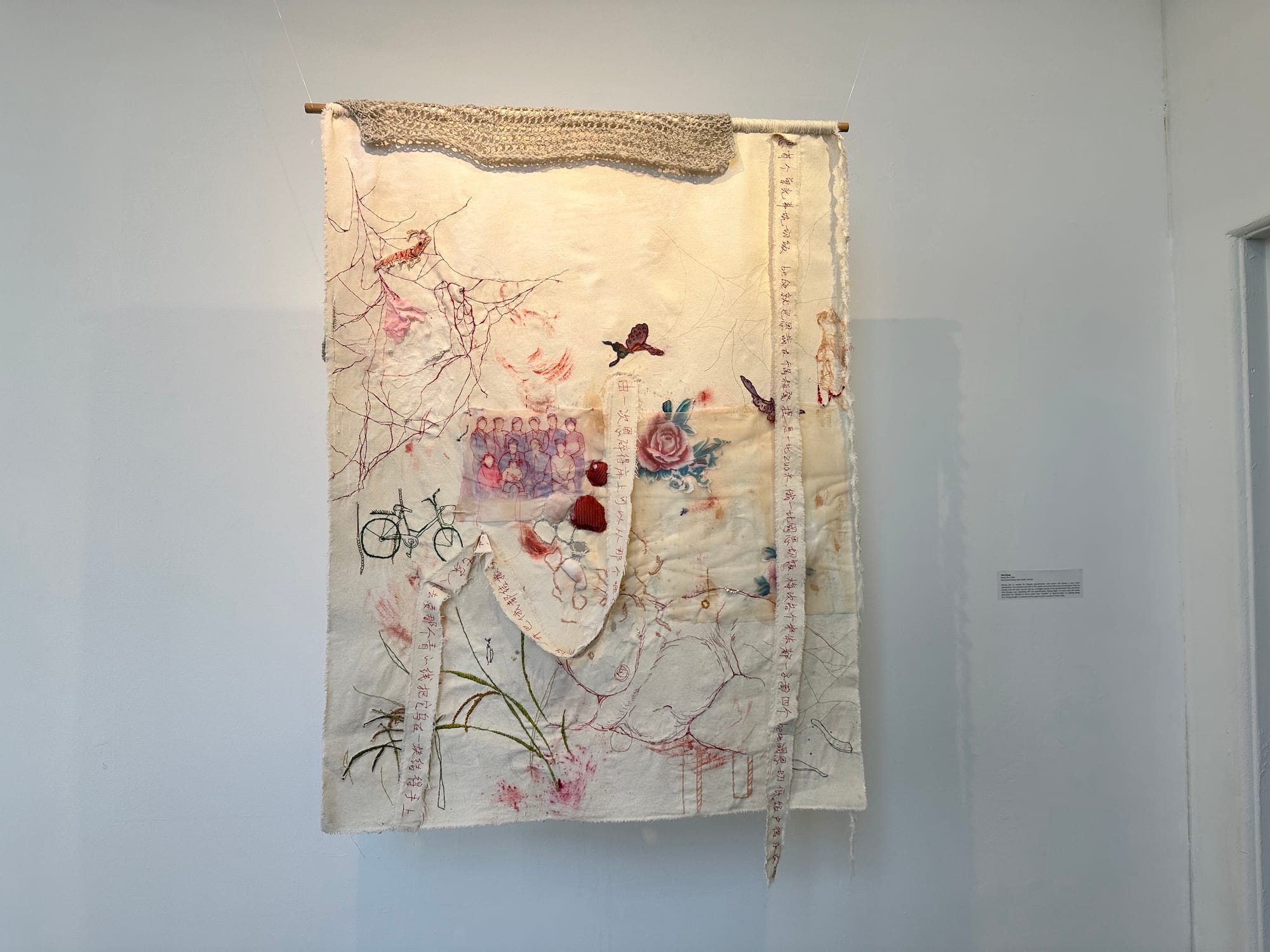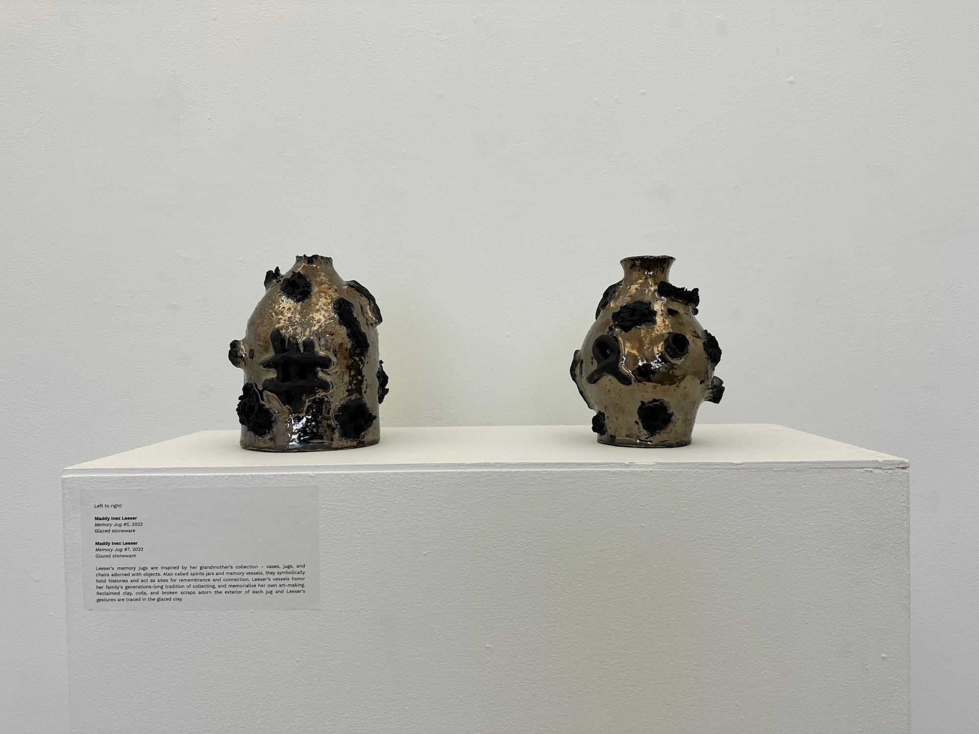 A classically trained oil painter from China, artist Yike Zhang recently shifted her focus toward textiles. In “Wang Zhu” (2023), hanging near the gallery entrance, the artist paid homage to her grandmother, after whom the piece is named. Zhang delicately weaves multiple layers of fabric into a form that appears almost scroll-like, combining Chinese text with different types of imagery, including a sewn-in version of a family portrait. Another artist working with memory, Maddy Inez Leeser also takes a cue from her grandmother. The artist based her beautifully glazed vessels, “Memory Jug #5” and “Memory Jug #7” (both 2022), on her grandmother’s spirit jars, which she collects as a way to symbolically hold space for the family’s history.