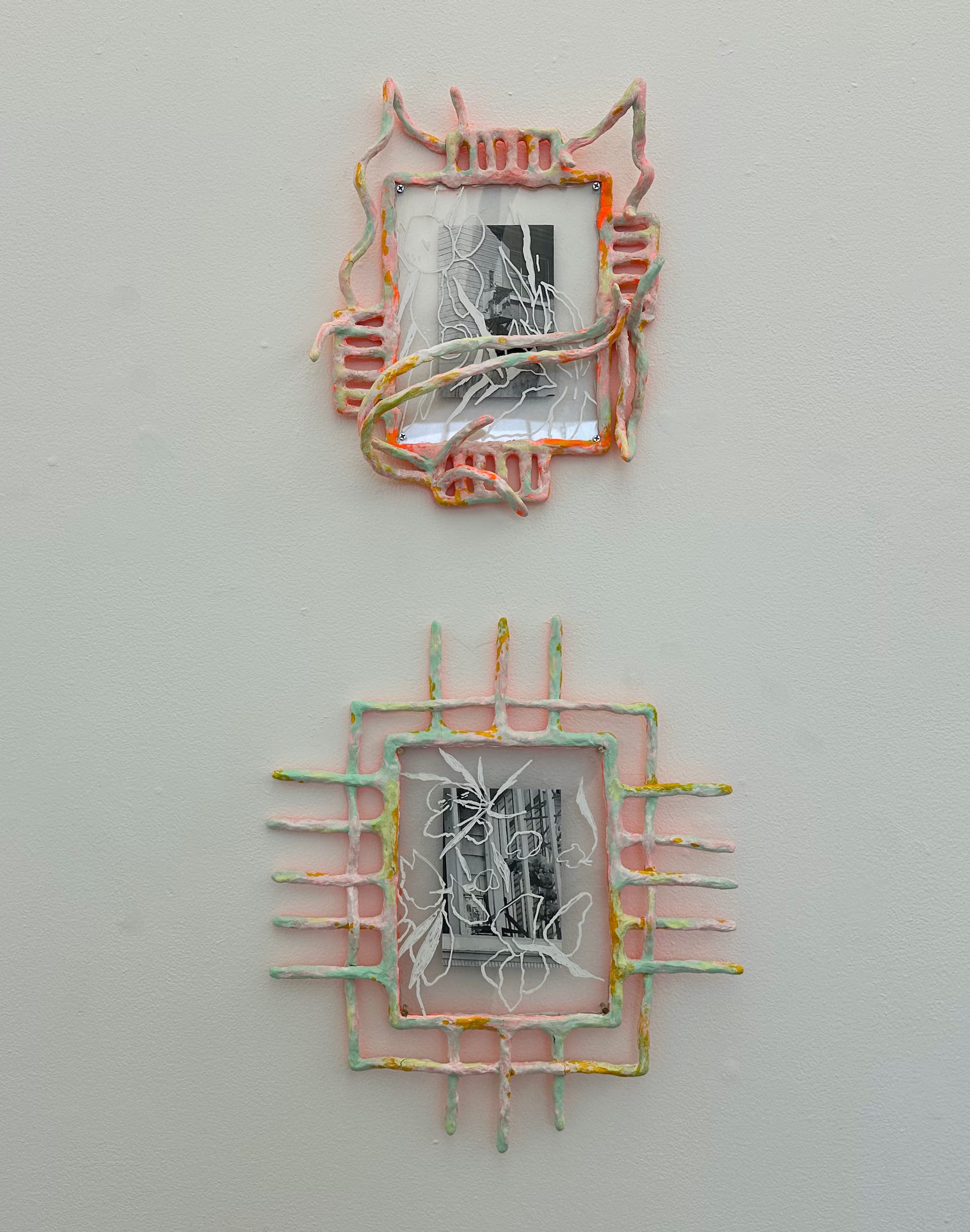 On walks around their Oakland neighborhood, artist Tracy Ren took photographs of outdoor altars they encountered, which became the starting point for “Threshold #3” and “Threshold #2” (both 2022). Ren encased these images of altars in meticulously crafted clay frames and added their own drawings to create the works, essentially creating shrines of shrines. While not directly tied to the artist’s personal history, like many of the exhibition's other works, these pieces make visible the ways cultural tradition and spiritual practices that can be transmitted within communities outside of the family unit.