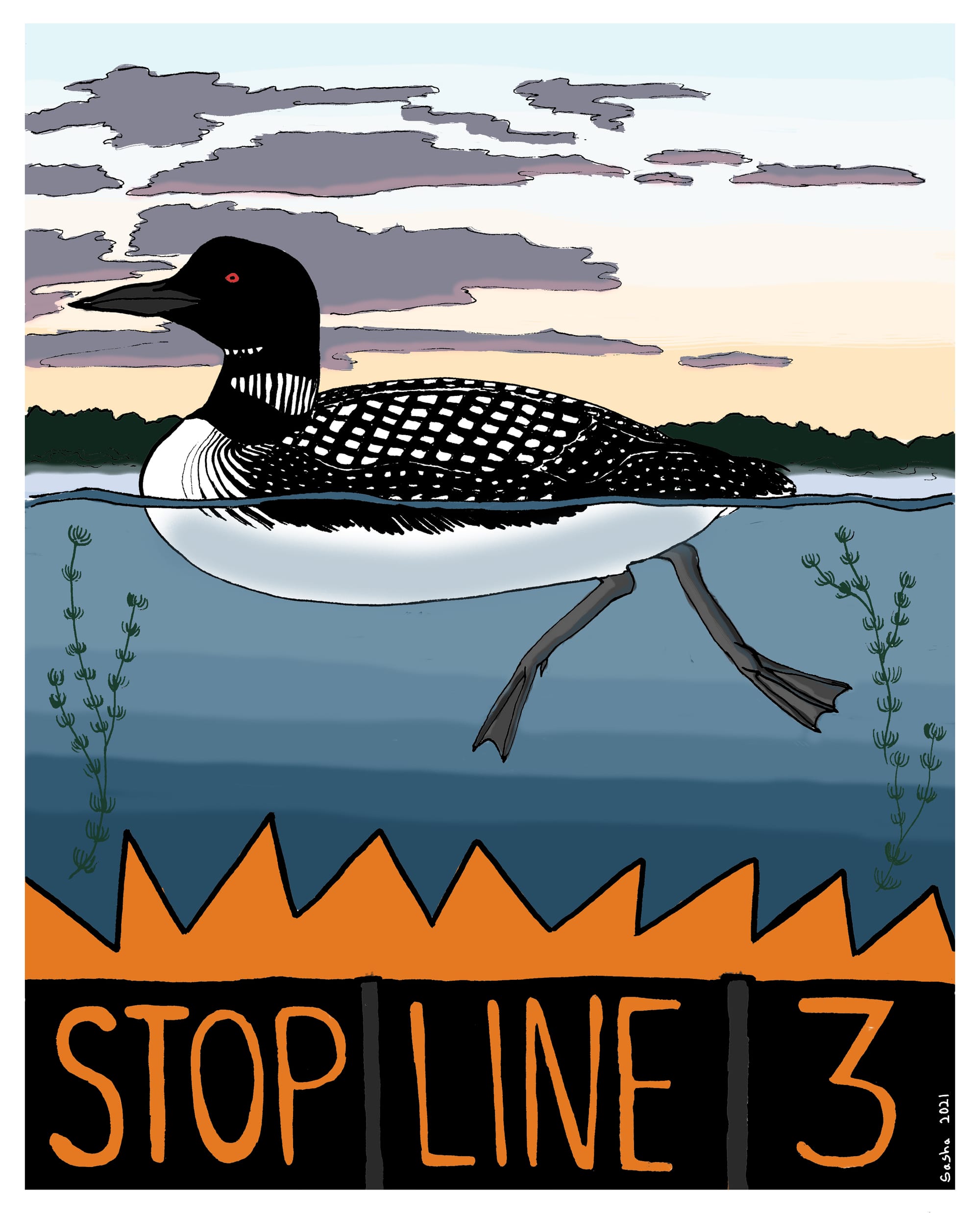 Looming over each piece is the climate crisis accelerated by new pipeline construction, and artists draw attention to animals directly affected by climate change. JustSeeds artist Andrea Lomanto aligns the stars of Ursa Major, which was first identified by the Wampanoag people, on a large black bear ripping a snake in two. One simple yet effective painting by Sasha Hill depicts a loon, an Indigenous symbol of guardianship and Minnesota’s state bird, floating on a lake at sunset. The colors of the sky and sea evoke nostalgia and serenity, yet the bird’s averted gaze and rigid posture hint at a danger seemingly just out of the frame.