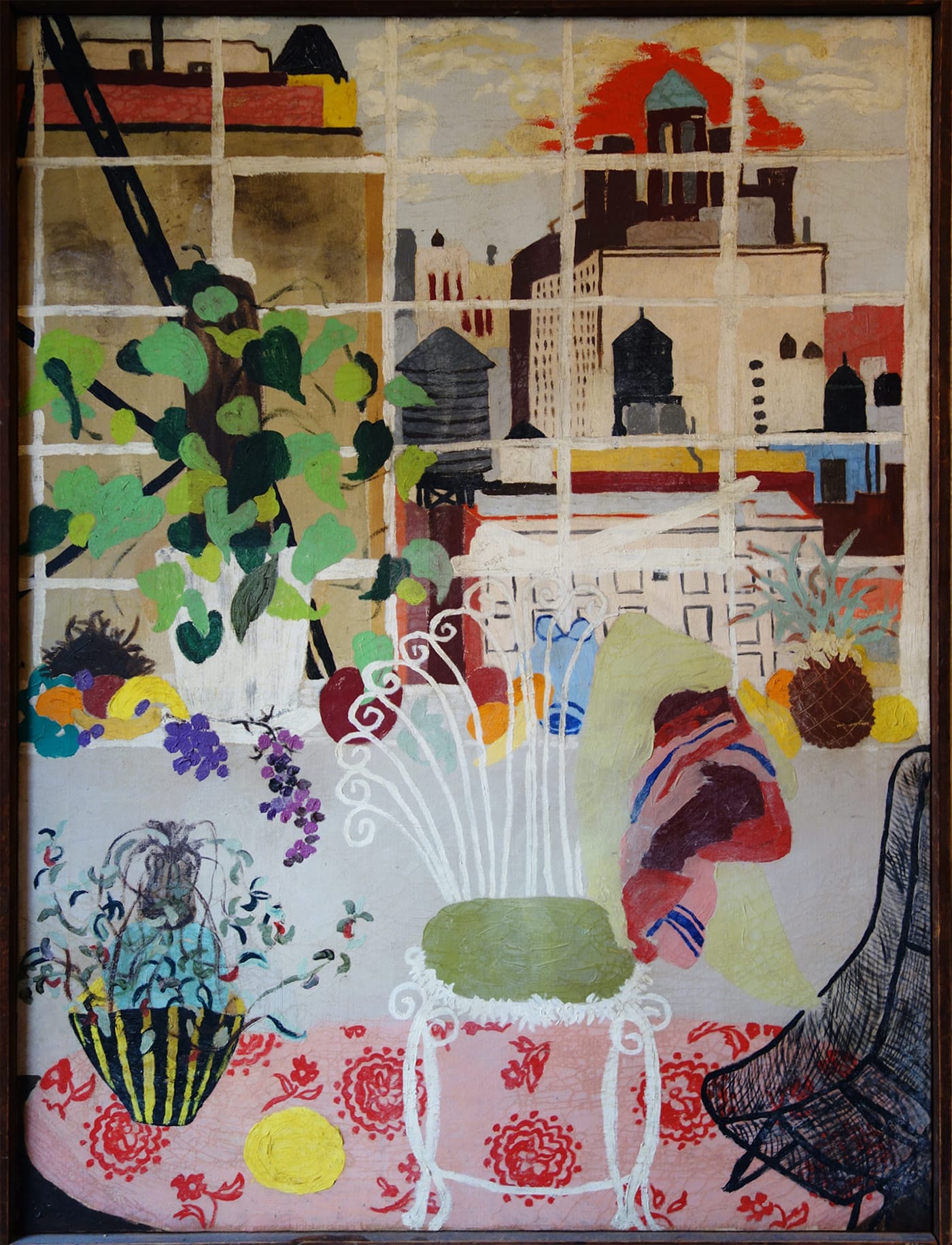Before this March, when many of us had to contract into a monastic life of introspection, I saw the painting as a landscape — I had always focused on the fiery red sunset above One Fifth Avenue and the water tanks. The philodendron plant hanging in front of her window made sense because we had those plants in front of our windows. Lenita’s painting was always that, a window that was akin to our own: similar but not congruent.