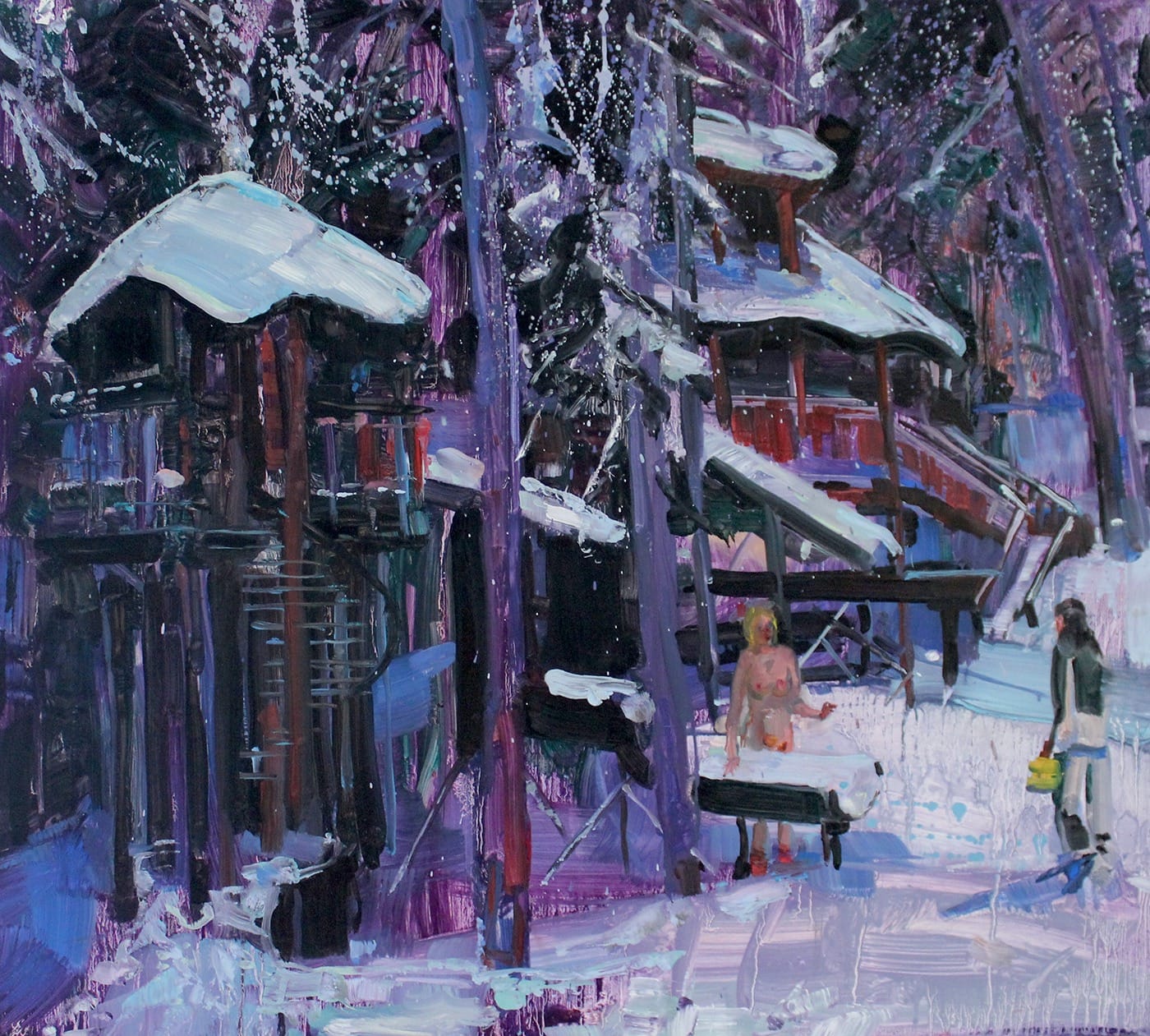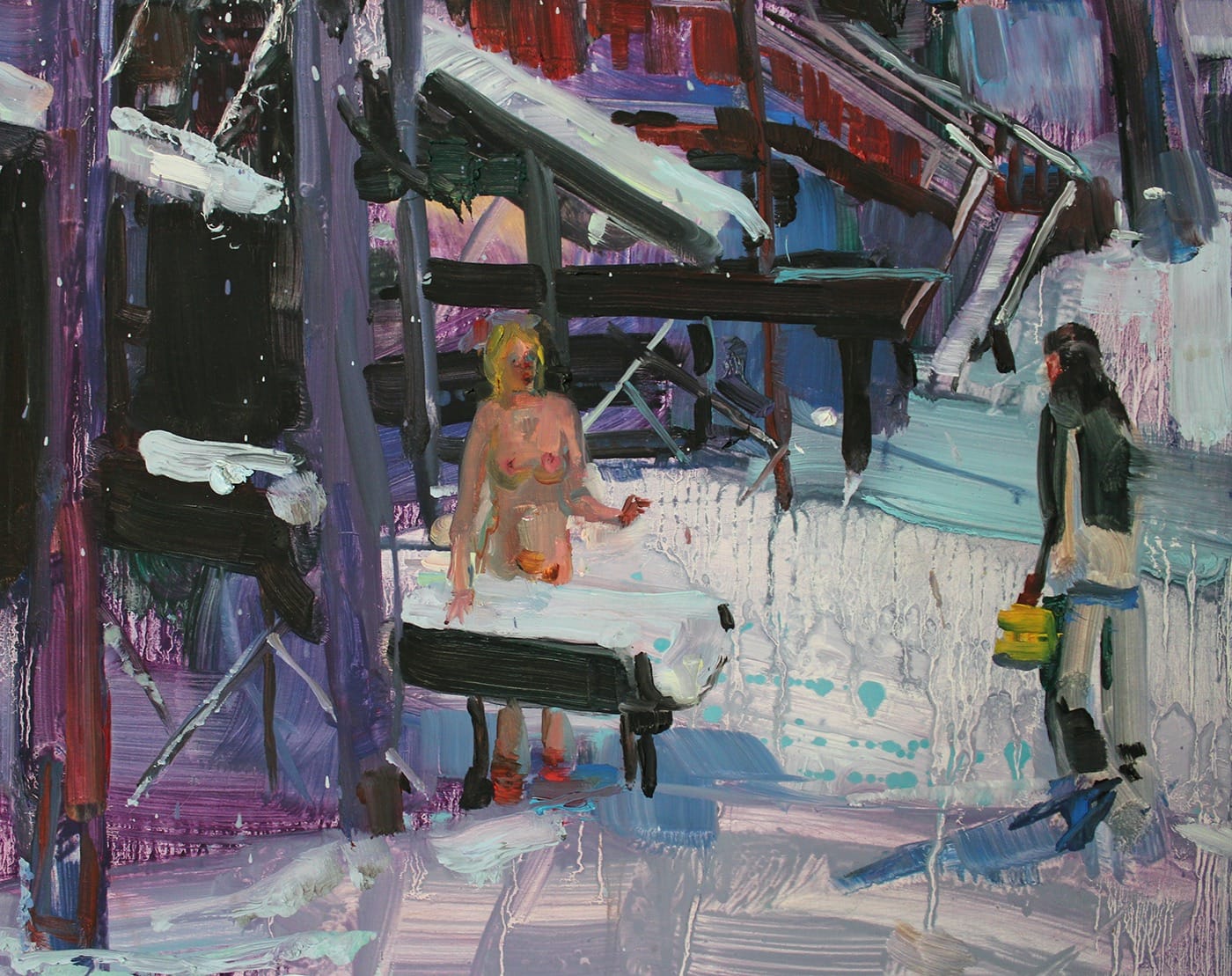 Christopher Kuhn (Los Angeles, California): This painting by Angela Dufresne has always been a mystery to me. I live in the sunshine of LA, and the snowy scene conjures a glimpse into another world. The treehouse structures seem fantastical. The violet blue tones of the landscape seem unreal. And of course, what’s that naked lady doing there?