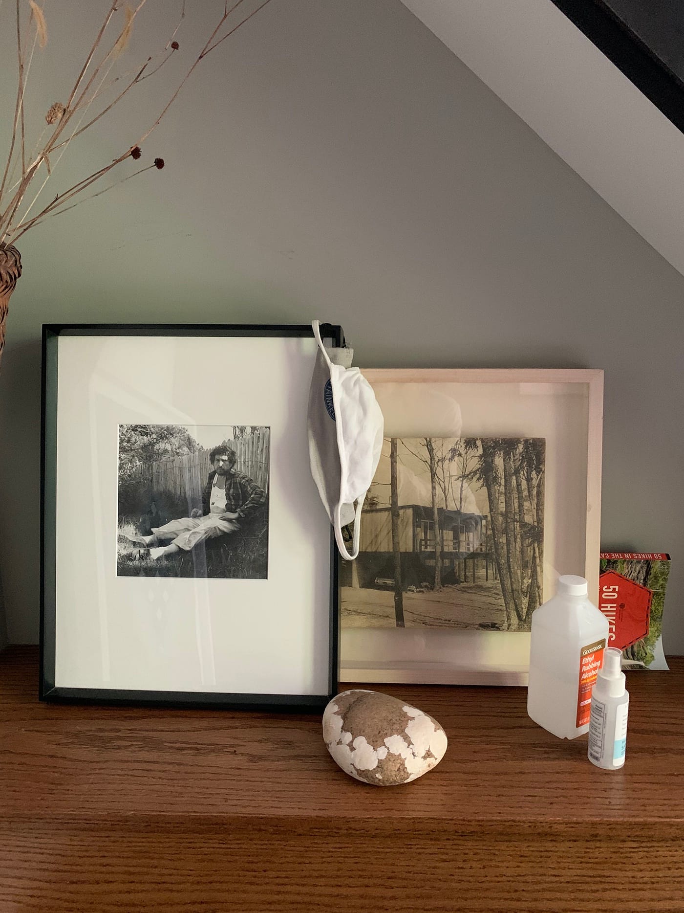 During these pandemic days the entrance to the house has become a sanitizing way station, and various alcohol-based cleaning products have taken up residence on the shelf along with the art. The precious photograph has become a place to hang a mask or two. Though the latest additions are not things I desire, they are things that my family and I need in order to stay alive. I want to feel open to them, even grateful. Accepting these changes, I feel enfolded into the fragile membrane of our pandemic lifestyle, but with new appreciation of Dylan’s defiant, puzzled gaze and recollections of Ginsberg’s outraged incantations invoking political misdeeds and bodily embarrassments. I need them more than ever at the front door.