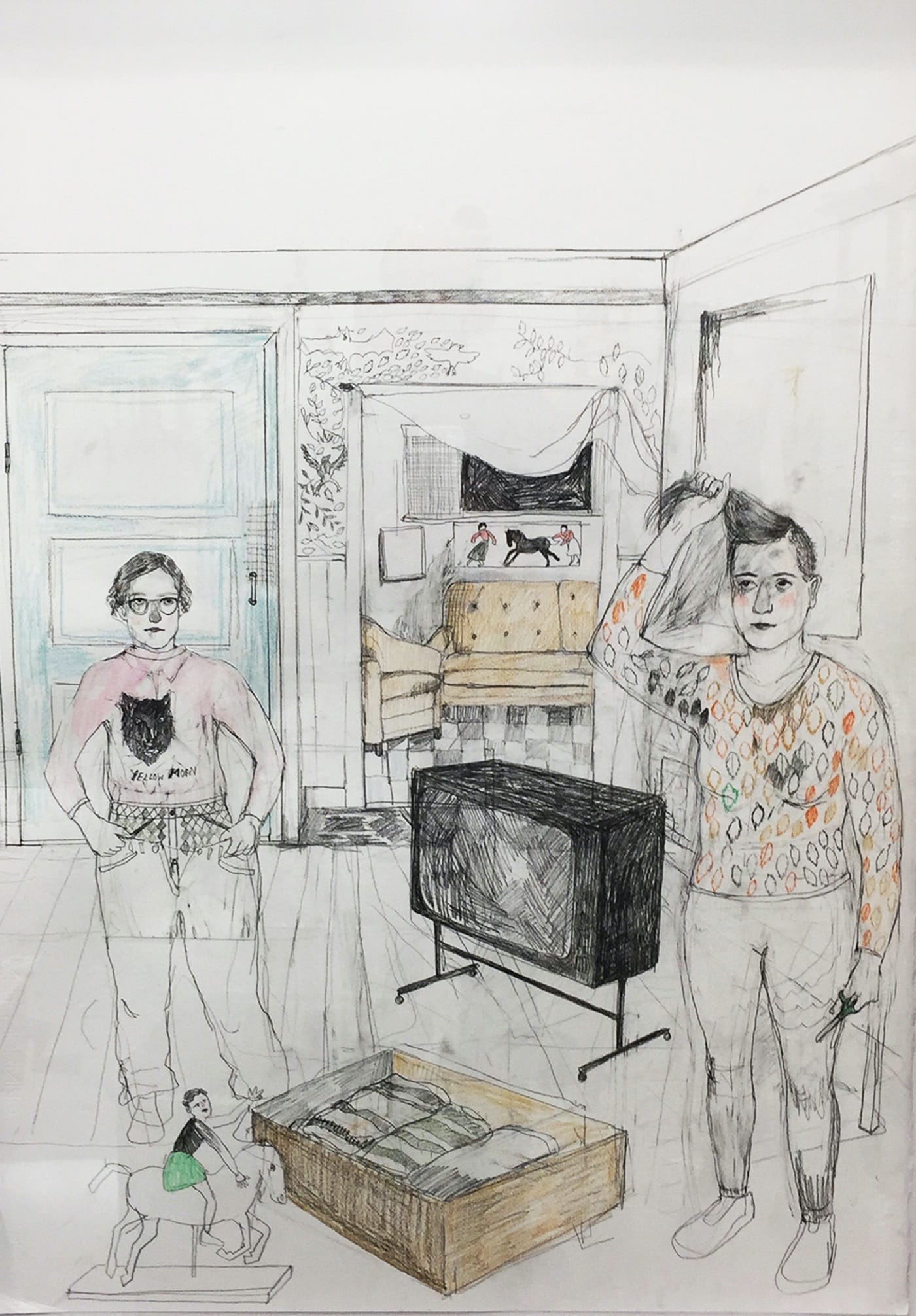 TL Solien (Madison, Wisconsin): Erika Nordqvist’s work engages me by both its subversive narrative ambiguity and the visibility of her editorial process — an important aspect of her graphic resolution that evokes a kind of kinetic aspect to the characters and contexts she creates. Her patient means of discovering form, shifting location, and altering body language and facial expressions fills the image with nervous energy and uncanny formal juxtapositions. Everything is alive, albeit quiveringly unstable. Four years ago we acquired Nordqvist’s large drawing, “Fat TV”.