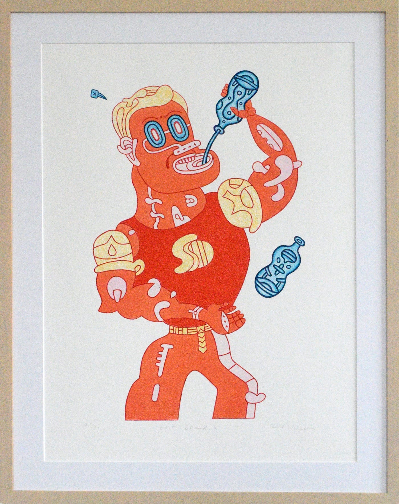 JoAnne Carson (Shoreham, Vermont): The piece that has changed the most radically for me in the COVID era — in fact it feels like it has completely transformed its meaning — is this Karl Wirsum lithograph from 2009, titled “Exit Brand X.” Pre-pandemic, I viewed Wirsum’s image of a muscled man dressed in a Superman costume and guzzling from a blue bottle as comic shenanigans. He seemed to be the guy at the bar pumped up on booze, mansplaining and swaggering around as a superhero wannabe. Now I see that he is Donald Trump. I don’t know why I didn’t see this before. The print is in our living room and when I am watching the PBS Newshour and Trump is on, I quickly look over to check “Exit Brand X” and, yup, it is Trump.