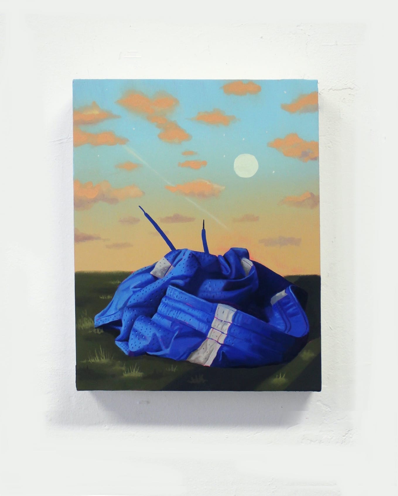 I see Danny’s painting when I wake up each morning. It hangs directly in my line of sight when I open my eyes, but maybe now it feels different. Now the shorts have become a stand-in for me, or for us — alone, discarded, exposed — but it remains such a beautiful scene. If I have to be discarded, let it be in the beautiful green space of this painting. I notice the sky more now than I used to — that last light fading, the slippage of time caught for a moment and forever.