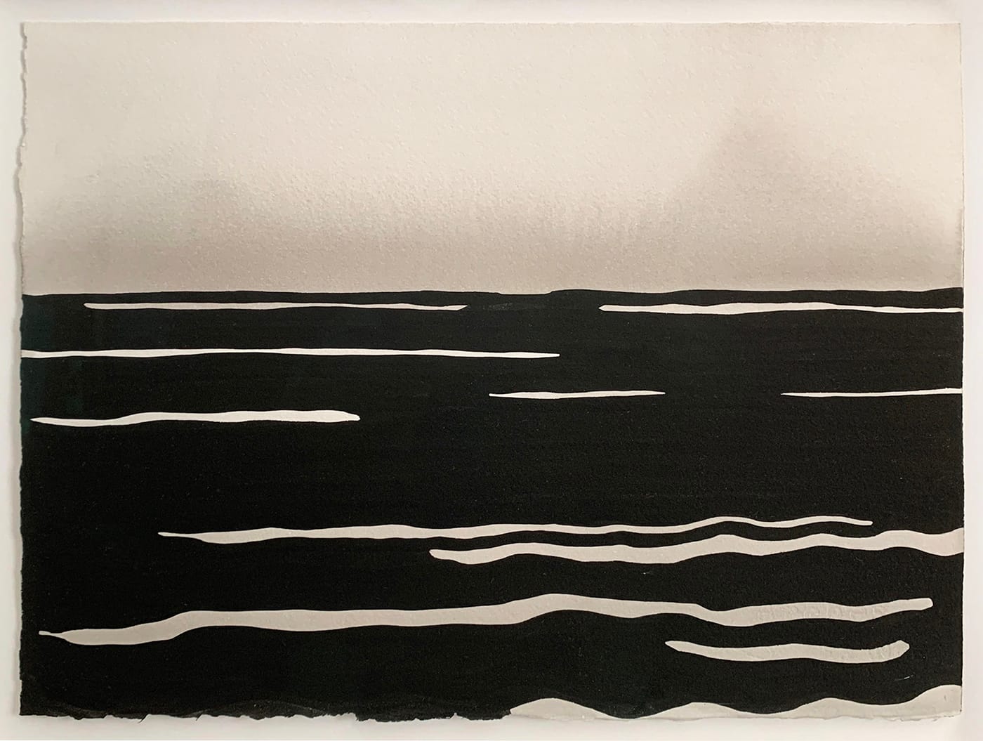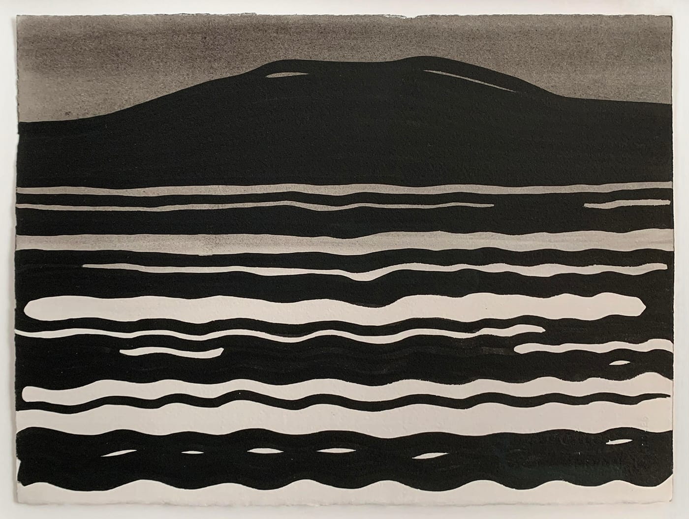 In the painting on the left, “Observatory Mountain,” a rippling lake foregrounds the silhouette of a summit that Eric has painted repeatedly on visits to Maine. When we hung this painting after moving to Beacon, we discovered the uncanny coincidence that Mount Beacon, visible from town, shares the same angles and undulations as Eric’s “Observatory Mountain.” In its sister painting, “Fog,” the lake is present but the mountain has vanished, exchanged for a gradation of gray wash that bleeds upwards towards raw paper. The air has been stilled, the mountain obscured, and the ripples flatten toward straight lines.