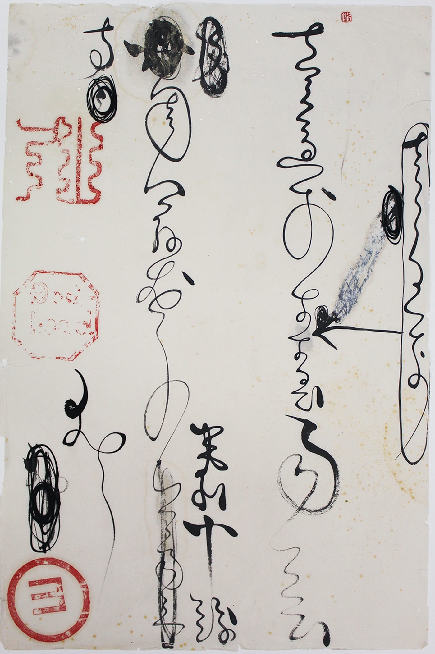 The invented script contains broken seals, scandalous whiteouts, and a directional arrow, all taboo in calligraphy tradition; the substrate, a thin, single sheet of mulberry paper flecked with shimmering gold chips, absorbs every mark. Swipes of glittering medium cross ink sporadically, adding subtle surface texture; tendril-like gestures transgress invisible lanes of emptiness, or become entangled as ungainly blots. Variations in ink tone create rhythmic arrangements from flourishes and fuckups. The drawing’s title is unknown, or perhaps it is untitled.