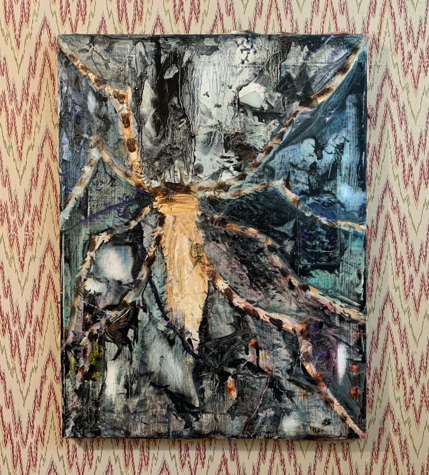 The spider’s form fills the space. The legs reach out to the edges and corners and structure the composition. Wispy brushstrokes with bits of brown, orange, and yellow imply motion and texture. Muted washes of deep blues laced with almost glowing lighter shades surround the core and left legs. Floating ephemera and a few mica sparkles catch the light like dewdrops. Two thin sticks emerge, leg-like — they are glass shards, part of an enameled costume jewelry butterfly. There are layers of fabric and a playing card, peeling but sealed with paint.