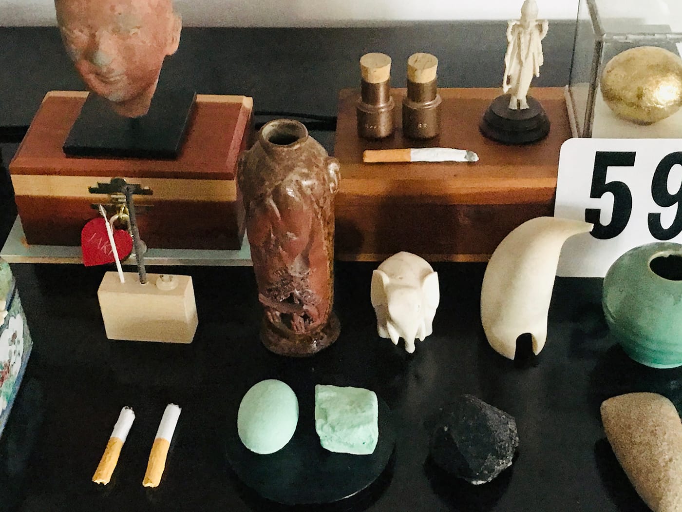 Rauschenberg’s ashes, and the ashes of his tortoise Rocky, are there as well, stored in small cork-stoppered engraved copper vials. The ashes were given to the 15 immediate Rauschenberg staff members a few months after his death. Rocky’s last egg is near her ashes, gold-leafed in a small glass box. Carved wooden cigarettes by artist Aaron Frisby are alongside as offerings to Bob’s afterlife.