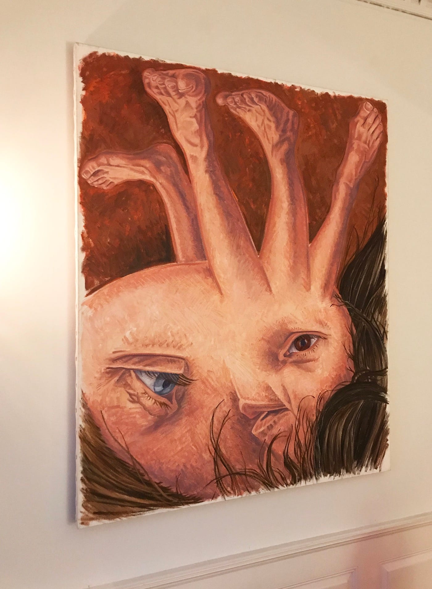 One thing seems obvious about the painting now that might have gone unremarked upon until recently: the skin that is represented is the skin of a white person. It is some sort of metric that until virtually yesterday that fact wouldn’t have seemed crucial to a description of the picture; it would have been okay to just say “skin.” But now it feels important to look at Alan’s interest in “human clay” as embodying issues of group as well as personal identity construction, an exploration of “white fragility” before it was named. It’s tempting to see this clusterfuck of body parts as illustrative of a group/cultural as well as personal failure to systemically cohere, to talk to itself and not know which way is up (Alan was white, Jewish, straight, politically very liberal).