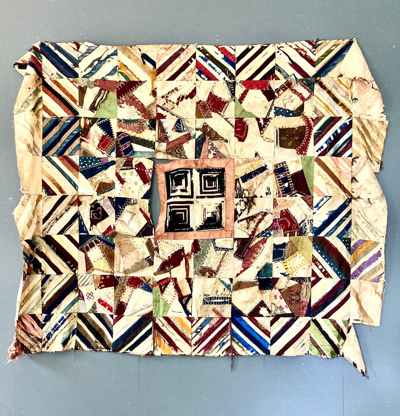 The “crazy quilt” style blends improvisational piecework and grid-based composition. This particular quilt is less improv, more grid. The ecru top dominates the overall effect, silk threads dangling loose. I have always envisioned the maker a tight-lipped Victorian New England Protestant. There is no fabric in the quilt that I associate with the American South, such as cotton in the form of gingham and seersucker. The outside border is made of pieced cigar ribbons (so my Mom says) laid together to form diagonally striped patterns on not-quite-square fabric supports. The interior pieces are jeweled tones of corduroy and silks punctuated with colorfully embroidered dogs, crosses, moons, stars, flora, wheels, and arrows.