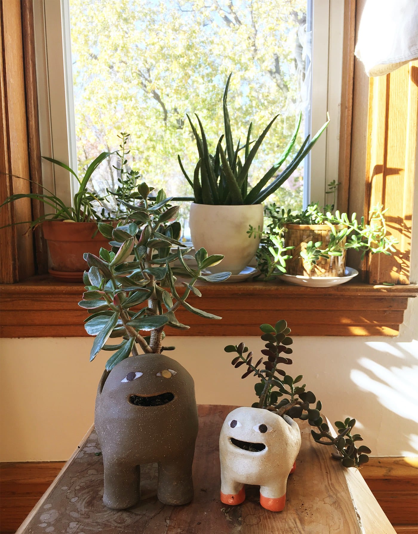 My husband bought these planters last year from Esmë Ogiyama. She was his ceramic instructor in a beginner class, and we both fell in love with her “little buddies.” They made me smile. I filled their bodies with plants and went on with my days. I’d water them, fertilize as needed, and occasionally stumble upon a new plant to add to the windowsill. I never thought too much of them. But now, when I come home from the studio at the end of the day, I drop my bags, wash my hands, and then walk over to check on all my friends. I often catch myself greeting them. “Hello! How are we today? Oops, feeling a little dry? Let's fix that.” New growth on my succulent gives me a rush of dopamine. A new monstera leaf feels like a triumph.