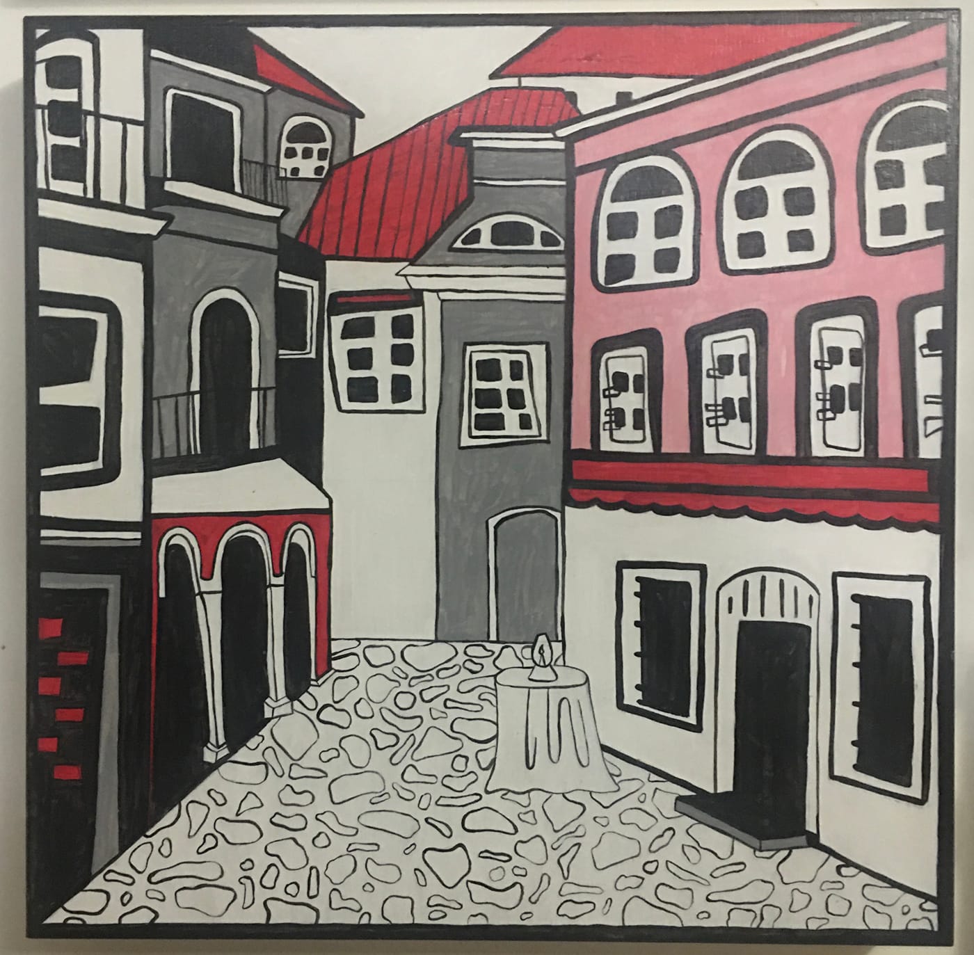 Michael Mahalchick (Brooklyn, New York): Hanging near my dining table is this untitled work by April Childers from 2015. It is 12 inches square and depicts a candlelit table in a quiet Italian street. The image, appropriated from the top of a take-out pizza box, is lovingly hand-rendered on a wood panel that also mimics the dimensions of the pizza box.