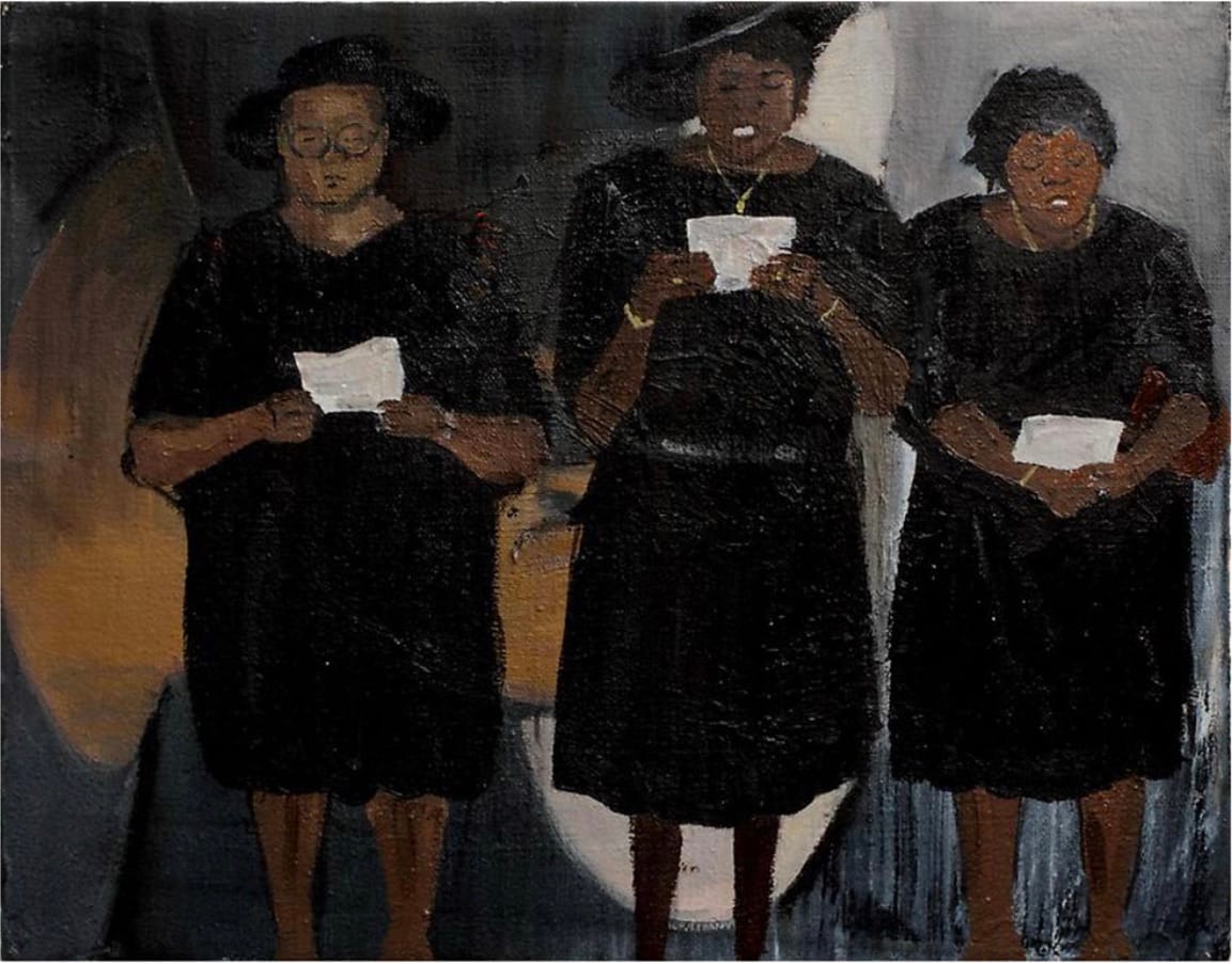 This small work is housed in a deep-set black frame. Three women stand together, each in a black dress, and each holding a white piece of paper in both hands, nearly filling the picture plane with their thoughts, respect, and presence. Paul told me that these women are his mother, grandmother, and aunt. After living with it a few years, I realized that the painting began as a portrait.
