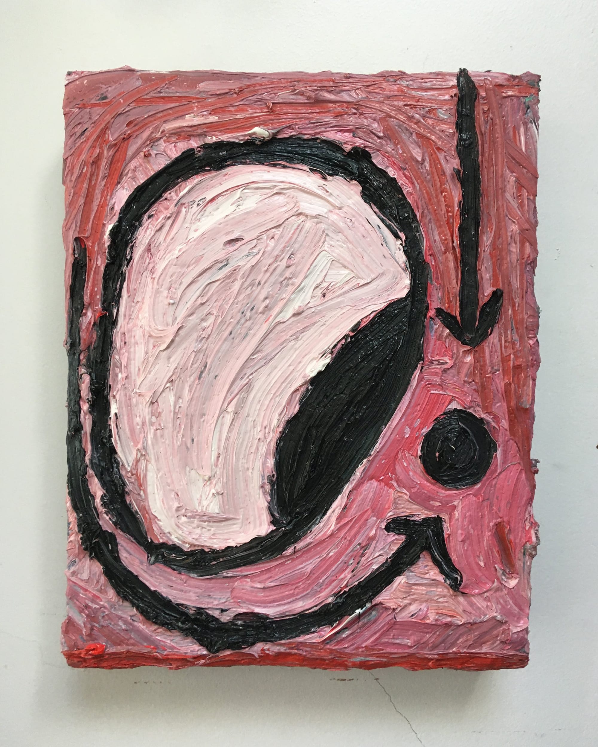 I knew I loved and wanted Susan’s painting, and I knew it would enhance my life in material ways, but what I failed to recognize was how it would endure. Unlike much of the rest of my life these days, Susan’s painting, in holding steady, has provided respite from unwanted change. This isn’t to say that it exists in stasis. Quite the contrary: it has proved itself to be a fully animated inanimate object. In times both good and bad it has offered inspiration. My family and I talk about it. We note the palette: the pink, the white, and the black. We puzzle over the imagery: the arrows, the eyeball, and the dot. We say how grateful we are that it hangs in our home.
