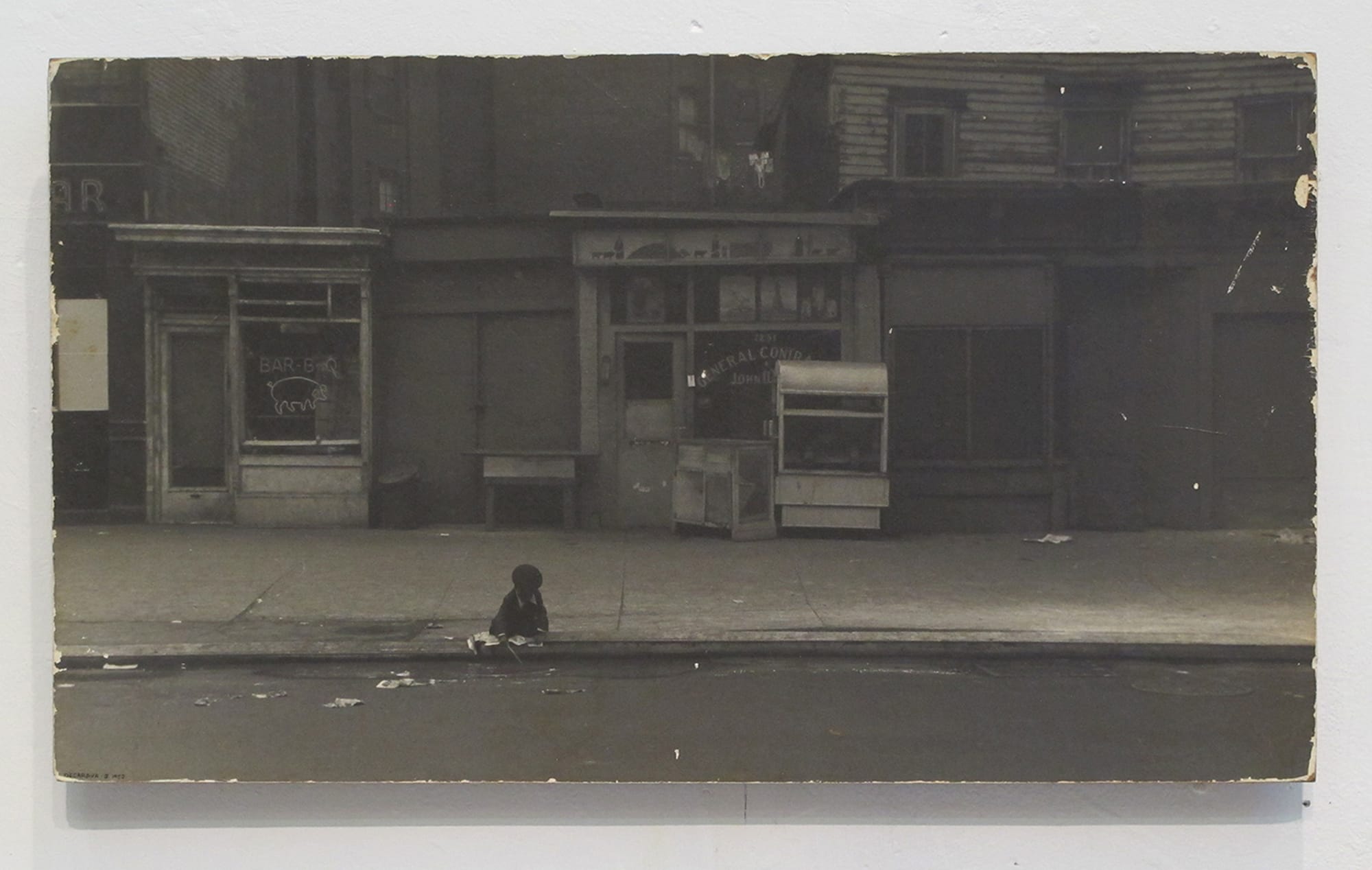 Kenji Fujita (Staatsburg, New York): I got this photo, "Child Playing at Curb, Eighth Avenue" by Roy DeCarava, from my parents’ old house. It is mounted on masonite, its surface is crackled, and some bits have chipped off along the edges. I grew up with this photo, an image of a small child in front of a row of empty storefronts. What I saw was a little boy who was on his knees, by a curb, with his face down, an abandoned child on an abandoned street. It's a black-and-white image, but not bright, so it was a little hard to see, especially where it was hanging in my parent's dark foyer in the apartment where I grew up on Central Park West. I liked this photo, but I wasn't particularly close to it. It wasn't mine — it was my parents’. So when I retrieved it earlier this year and brought it to my home, I gave it a closer look. Written in tiny block letters on the lower left corner is the artist's name: "DECARAVA - © 1953.”