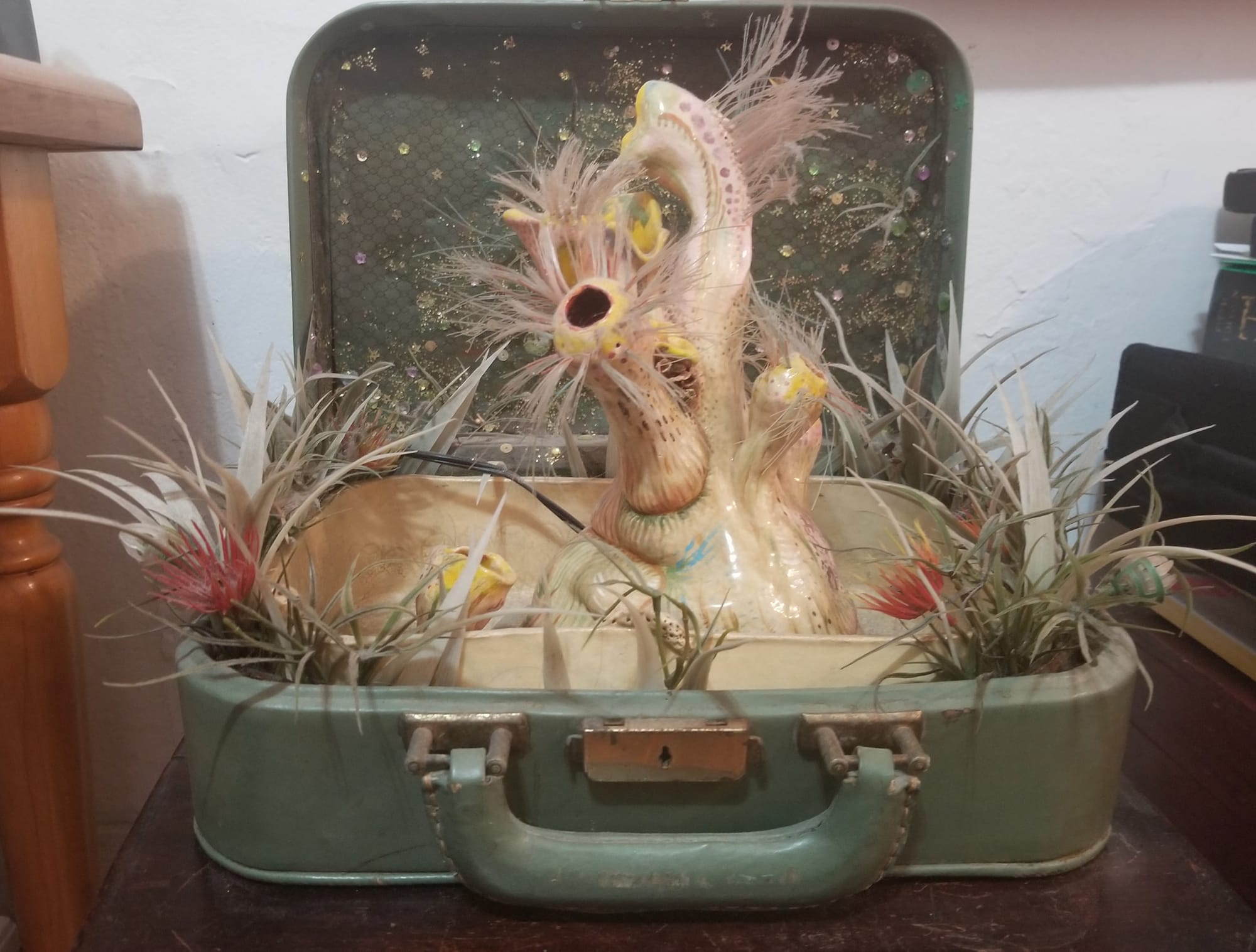The sculpture is a working water fountain built inside an army-green vintage suitcase. In the middle of the suitcase is a biomorphic form resembling a plant with tufts of microfilaments sticking out, and around the edges there are plastic leaves of grass.