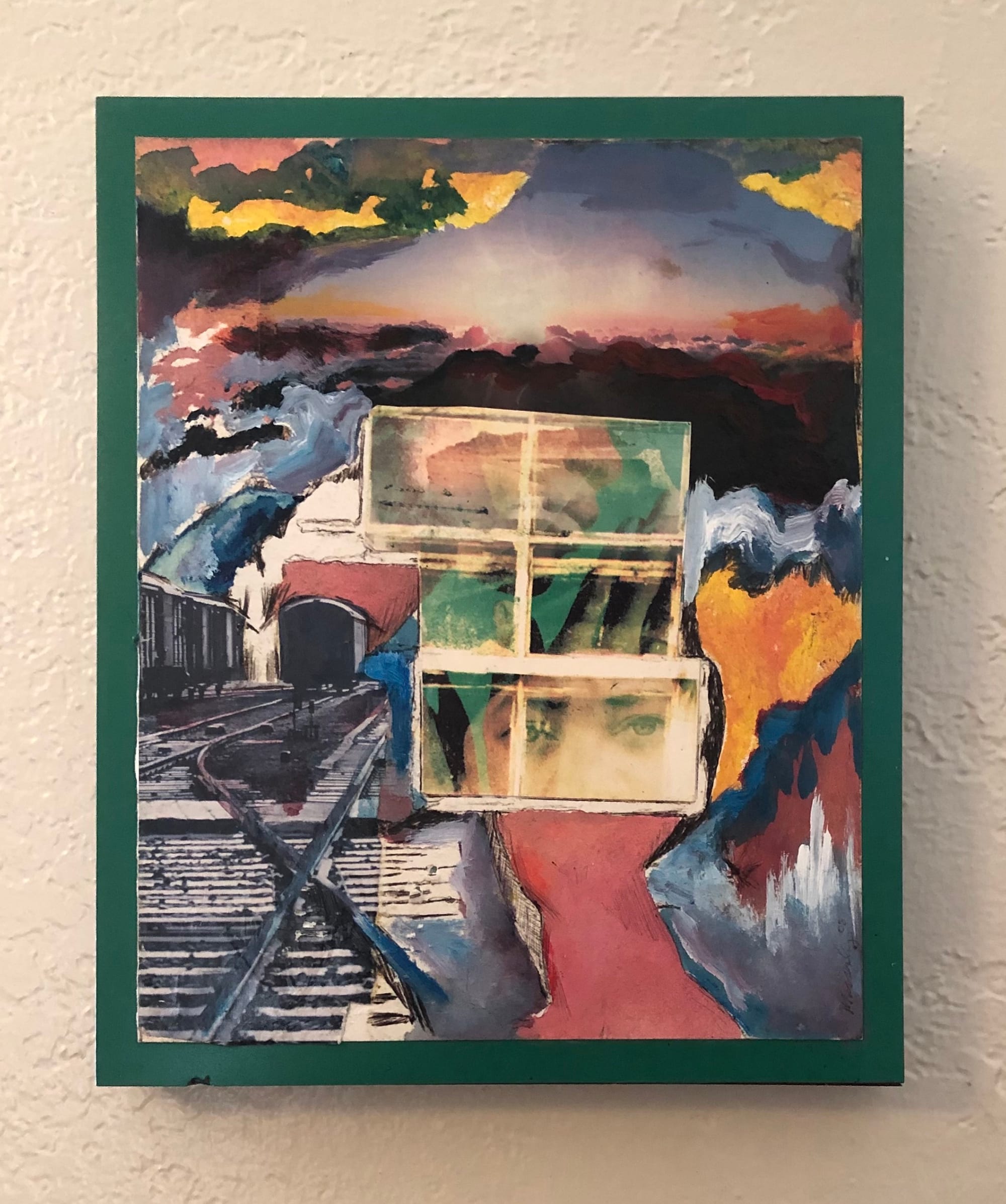 Underneath a faint tint wash, there is a second cropped face, a profile and hands in prayer against a contrasting bright green background. I hadn’t noticed this nearly abstracted image in the middle section until very recently, during this pandemic! The praying figure and the woman with the solid eyes are undeterred by the train tracks crossing in different directions in the left corner, or the black, foreboding tunnel in the distance. The umbrella sky above everything gently breathes and stabilizes all that it covers, and I am energized as well.