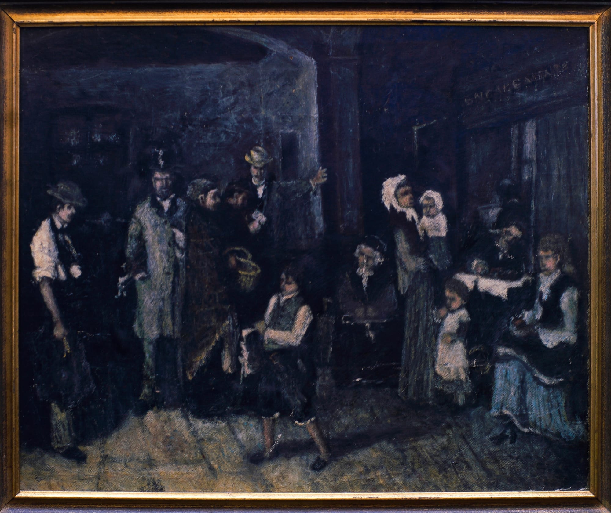 Perhaps the source for this image was an illustrated newspaper such as The Illustrated London News, The Graphic or Le Charivari. These were among the first newspapers illustrated with lithography. They published the sort of social realist images Van Gogh clipped and collected early on. The painting in some ways is reminiscent of early Van Gogh. The scene, an interior, appears to be a business or bureaucracy. The figures, clients, or customers, who are shabbily dressed in shawls and cloth caps, convey an air of dejection.