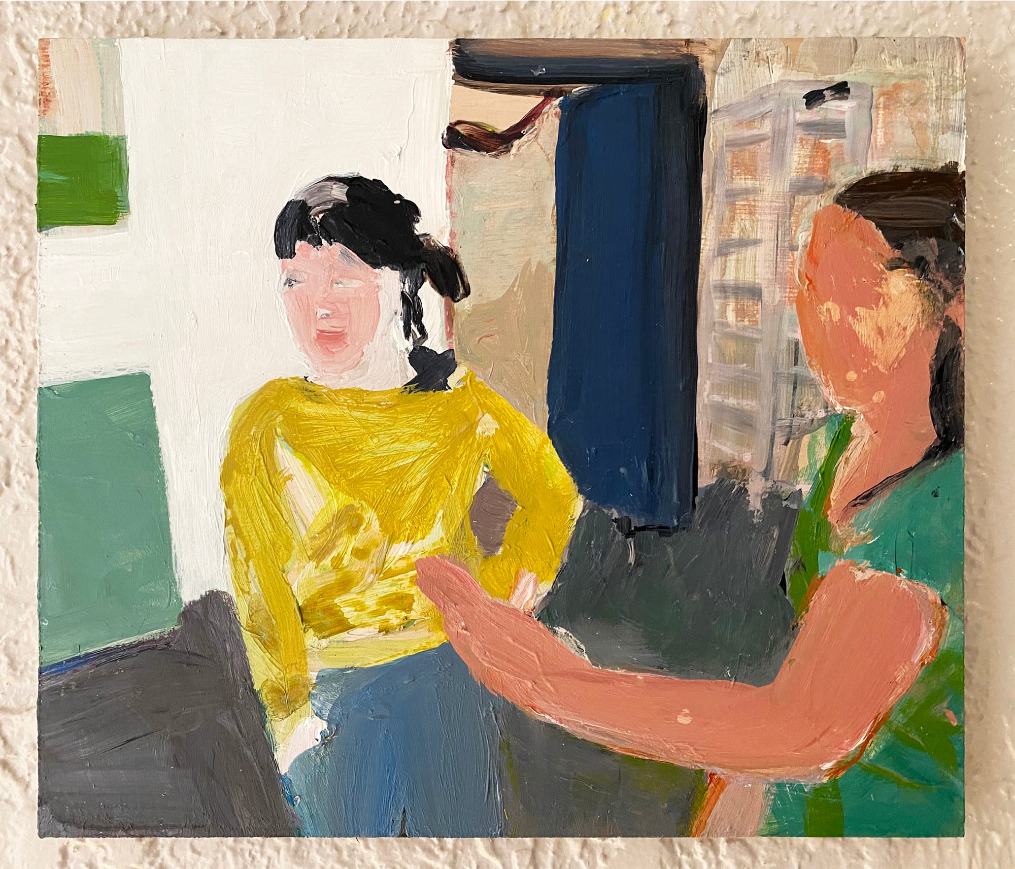 Aside from its vibrant complexity as a painting, it has personal significance for me. Kaveri generously made it after I shamelessly requested a painting with both of us in it. It captures a specific version of a frequent occurrence — the impromptu studio pop-in of grad school. I look at this painting every time I walk by, and it still evokes the comfort and closeness of the cohorts of youth. Its quirkiness feels like a badge of honor, evidence that we, our group, were special, our experience and our personalities unique, differentiated from those who came before and those who would follow. This painting has kept those feelings fresh and plump.