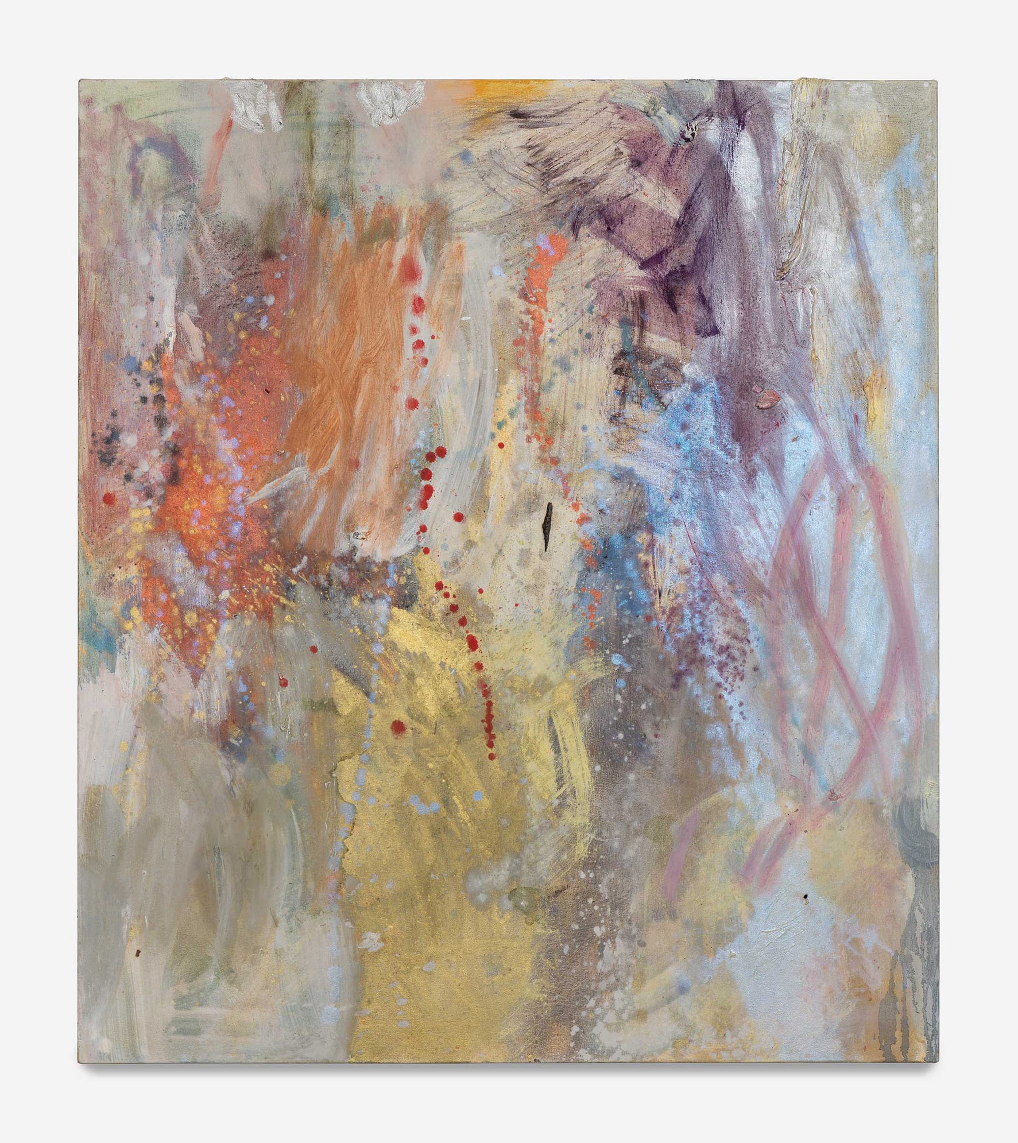 On the right side of the painting, there is a pink stroke that do-si-dos around an iridescent silver ground. Mid-morning, however, raking light causes the silver to give way to a pale-yellow ground, forcing the pink form to shoot forward. My read was obliterated and perhaps I was finally understanding her intentions. The painting is hardly trapped to its surface.