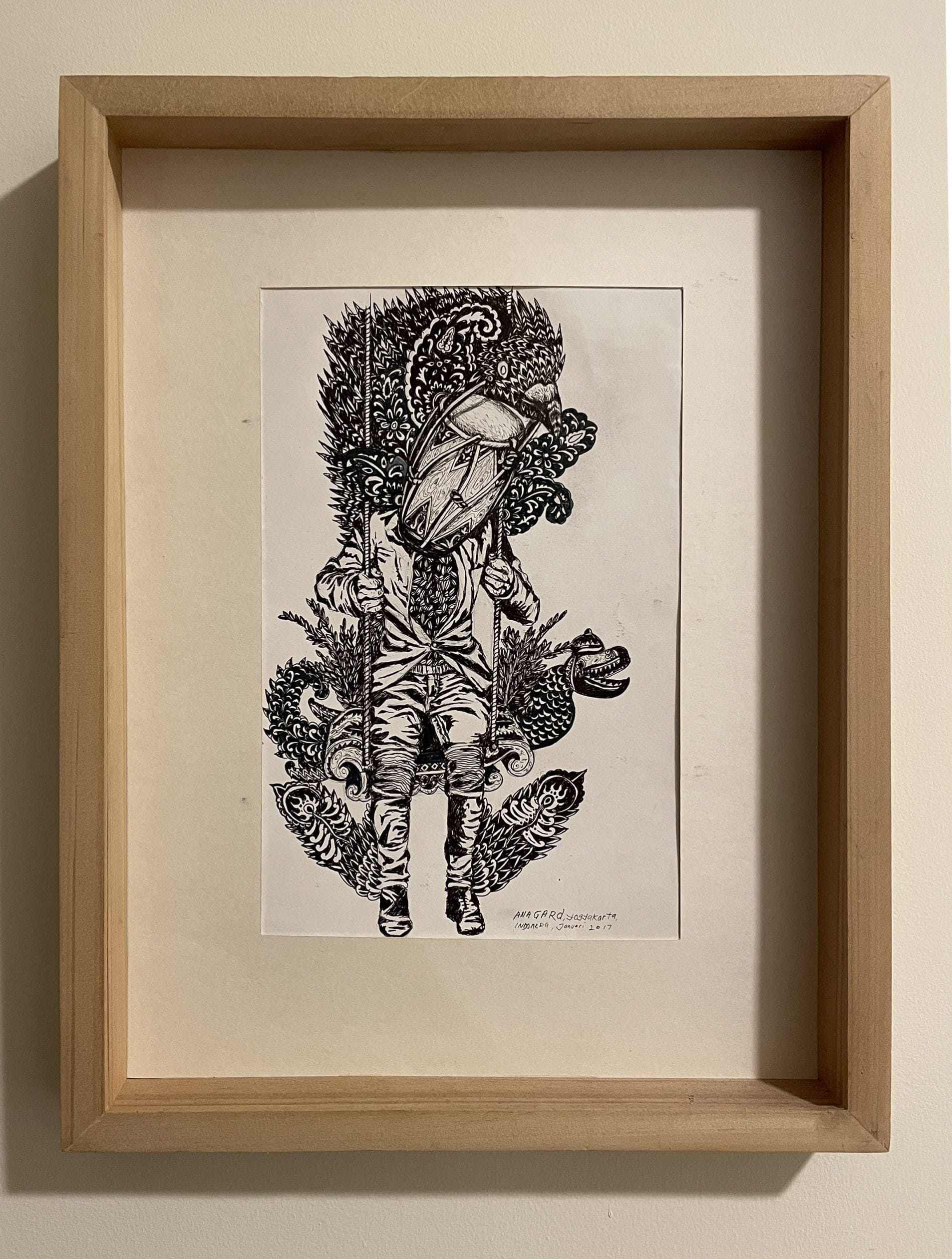 Antonius Wiriadjaja (New York City): This sketch of a man with an Indonesian drum for a head has been in the background of every video call I’ve made during the pandemic. Feathers sprout out of his buttoned-up suit as he sits on a swing made from a gamelan. His feet are winged, like Javanese shadow puppets. A crowned naga (dragon) peeks out from behind his seat, and leaves and flowers in the shape of a garuda (eagle) wrap around his shoulders.