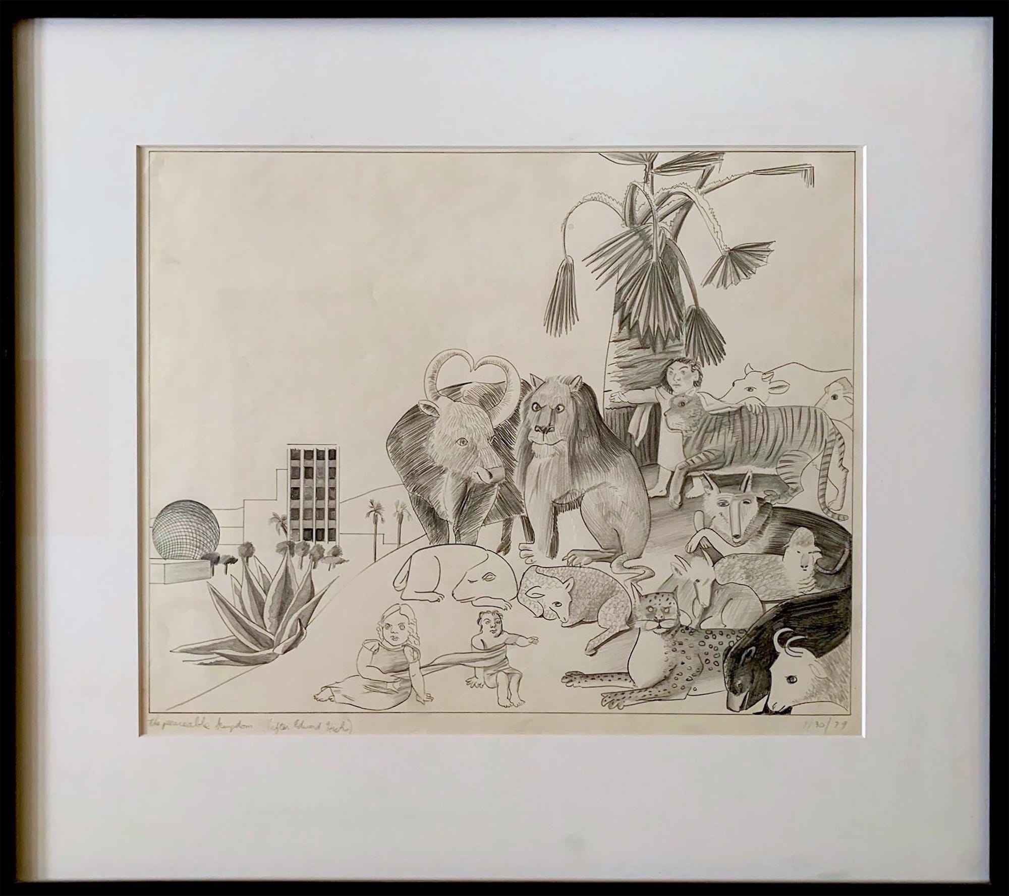 Lynn Aldrich (Los Angeles, California): “The Peaceable Kingdom” and the “Mouth of Hell” are two works in my collection that I actually bought, instead of trading with artist pals. Just so you know I was committed enough to part with hard cash. Graphite drawings by Los Angeles artists, they were purchased years before COVID-19 hit. But during repeated and prolonged shutdowns, their dialectical connections began to vibrate, and one day I rearranged everything so that they hang side-by-side.