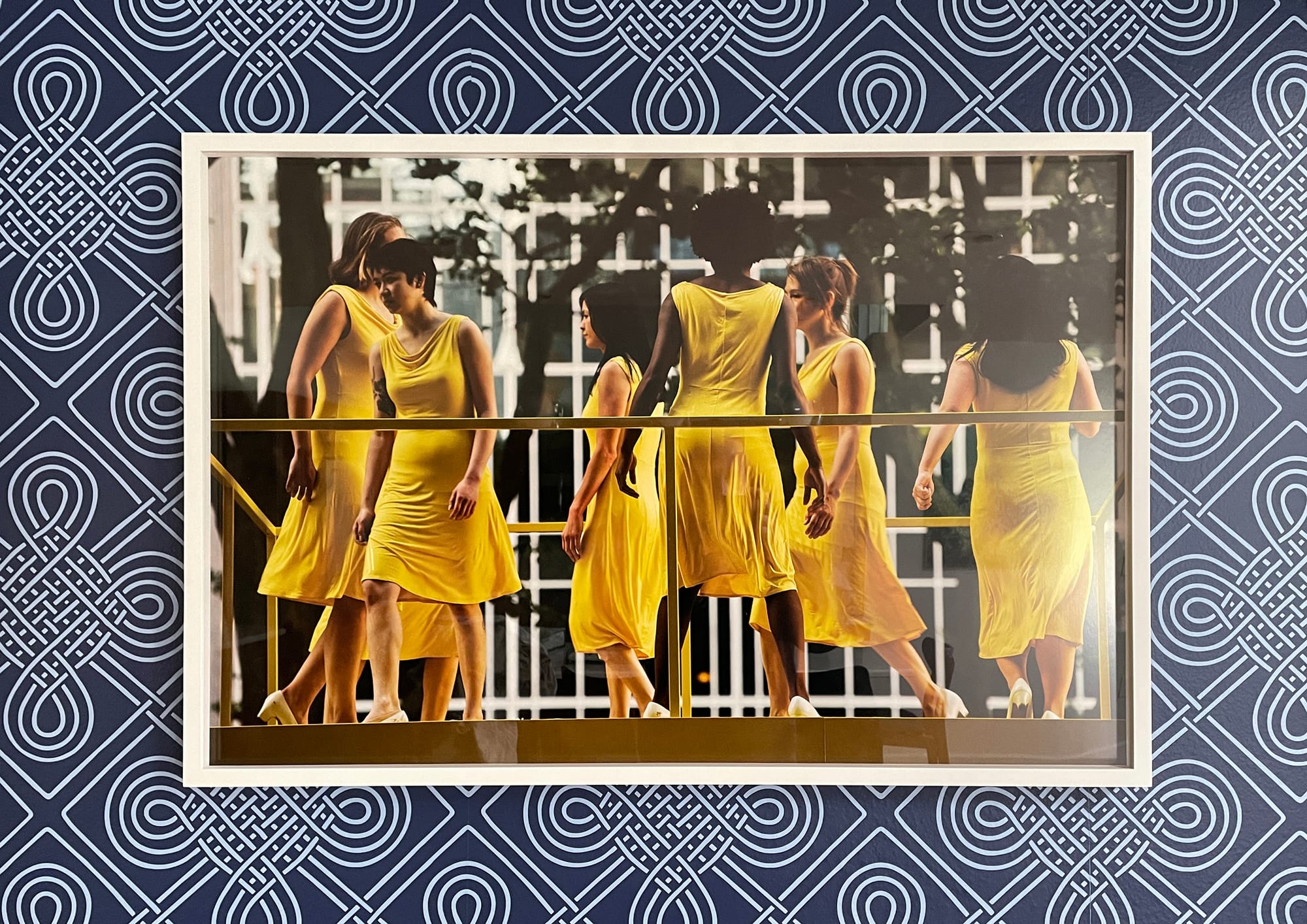 Kate and I went to grad school together at School of Visual Arts. She is a close friend and one of my favorite artists. I acquired the photograph when we traded works a number of years ago. The image is a still from her performance piece “Walk the Walk,” which took place at Bryant Park in New York in 2010. The performance was staged daily, during the work week from 8:30 am to 6:00 pm. The photo depicts seven women in matching bright yellow dresses and beige shoes. During those “business hours,” the women walked, stomped and shuffled around the roof of a pavilion that was the same yellow as their dresses. They represent the traditional office worker engaged in the drudgery and grind of the workday. It’s an empowering piece that requires stamina, strength, persistence, and perseverance.