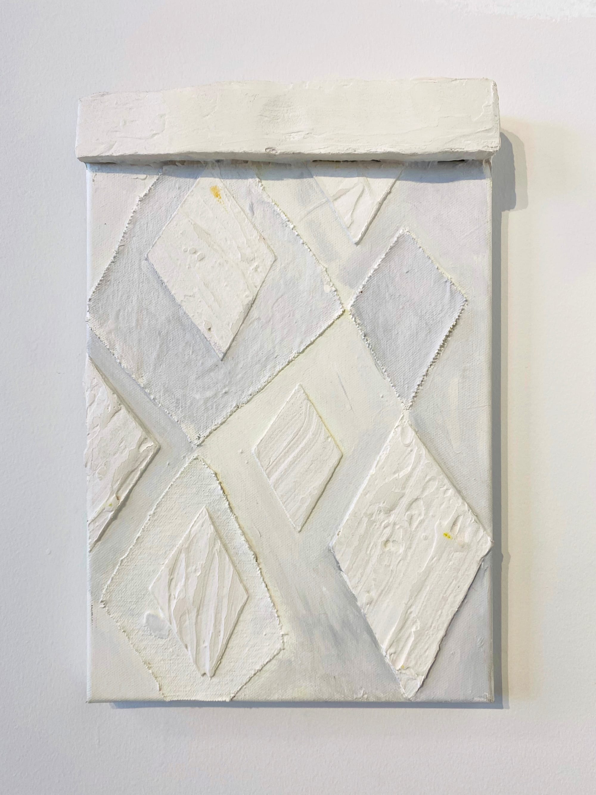 My relationship with “a cut in white lately” has deepened through the hours I’ve spent with it at home. It holds a mirror up to the moment. Its acute nuances speak louder than ever, now that so much has been cleared away. There is no color, not really, as in the way color owns painting. It is an open space with some obstacles, suggesting peaks and valleys, or aerial views, depending on where you are when you look. Daylight moves over it, suddenly unearthing subdued spectral hues that might otherwise remain concealed under a blanket of white. The white won’t last — it is temporary, as we all are. The object will soon accumulate the dust and dirt of life on its surface.
