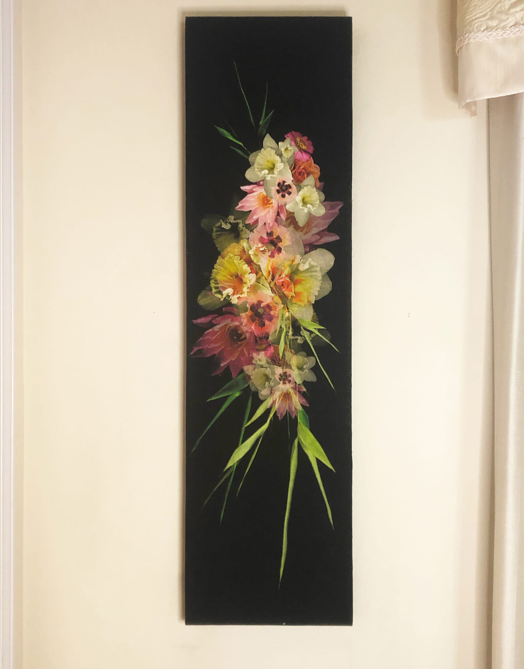 The floral spray floats in a sea of darkness, its colors amplified and glowing. I was immediately drawn to this series of Cynthia’s the first time I saw them, so it was my natural leaning to select one from it when we exchanged works.