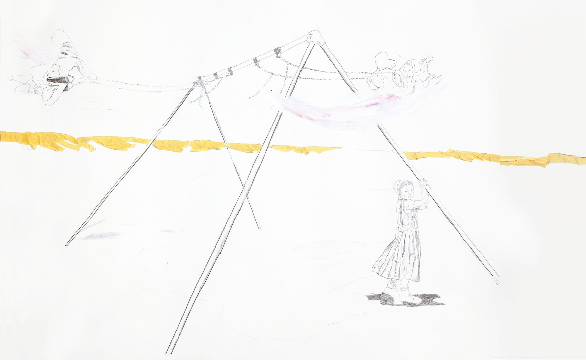 Max Blagg (New York City): Each new viewing of this Curtis Kulig drawing triggers a delicious endorphin rush, allows this reluctant septuagenarian to recollect in tranquility the pleasures and terrors of a misspent youth. The swing set evokes the playing field in my hometown in middle England, and the big kids full of teenage testosterone who constantly tried to demolish it with their extravagant exertions, although in this version the toughest kid is a girl. That small figure leaning pensively on the post is surely my own distant daughter, now grown, but still in my mind’s eye an angelic child.