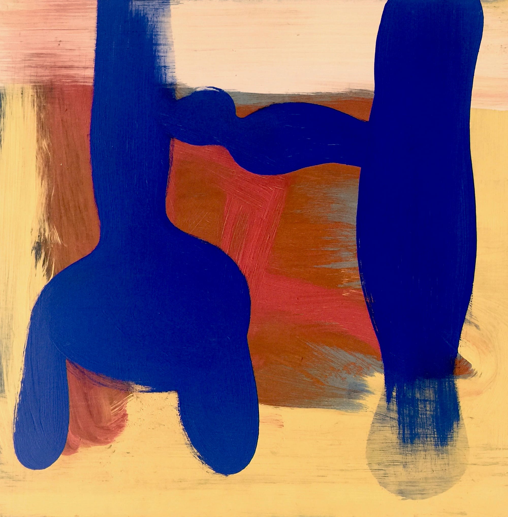 How did Heidi make such a small painting seem so big? How did she achieve beauty, humor and profundity in a single painting? I argue that the Yves Klein blue juxtaposed with orange makes for dramatic beauty and — forgive the anthropomorphizing — that humor lurks in the two small blue noses sniffing one another. Peter finds profundity in the way the blue shapes seem both planned and random. I like that the flat shapes are as powerful as the stones at a Stonehenge sunrise. Peter admires the bold use of yellow — a color that can easily take over a painting.