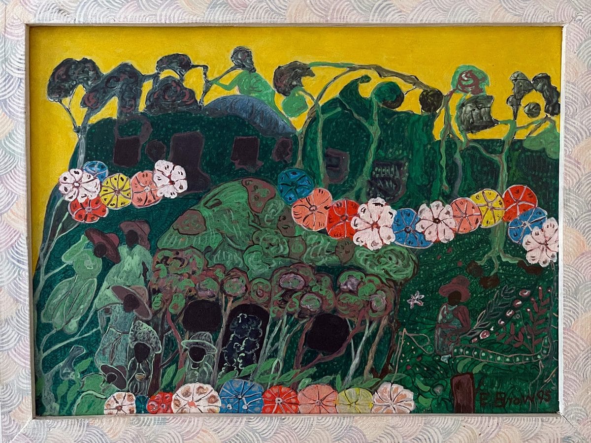 There I was fully introduced to his work — his painted musical instruments, his paintings, his spiritual objects and the painted walls. I was lucky to be able to experience the place where he communed with nature, surrounded by the lush landscape of Jamaica, one important inspiration for his work. I was fortunate to be able to purchase this delightful painting from him, which has hung in my bedroom for more than 20 years.