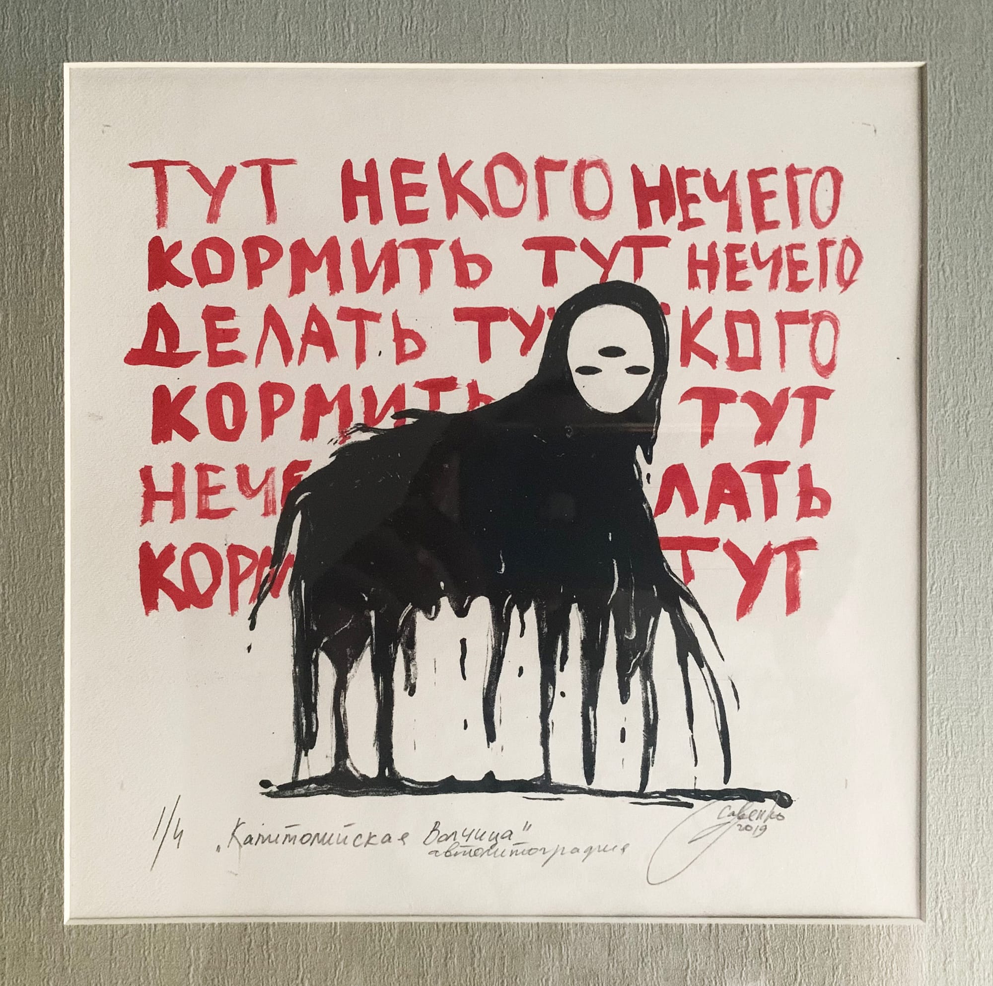 Rusudan Khizanishvili (Tbilisi, Republic of Georgia): The smallest piece in my collection is "Capitoline Wolf," an etching by Ukrainian artist Nina Savenko. The black figure reminds me visually of the figure of Death in Ingmar Bergman’s The Seventh Seal (1957). Applied to this image, the work’s title suggests the destruction and misery that empires bring. In the background, the phrases in Russian repeat: “Here, there’s no one to feed, here nothing to feed anyone, here there’s nothing to do."