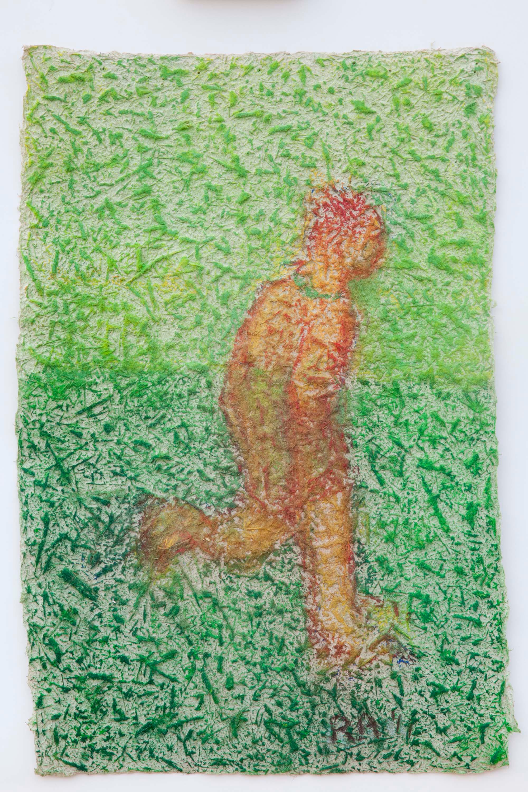 Artschwager’s “Man Running (Orange 1),” a small oil pastel, was shown alongside his rubberized hair sculptures in his ’T’ Space exhibition. I fondly remember photographing Richard painting one from the Man Running series on an easel by his piano in his home in 2011.
