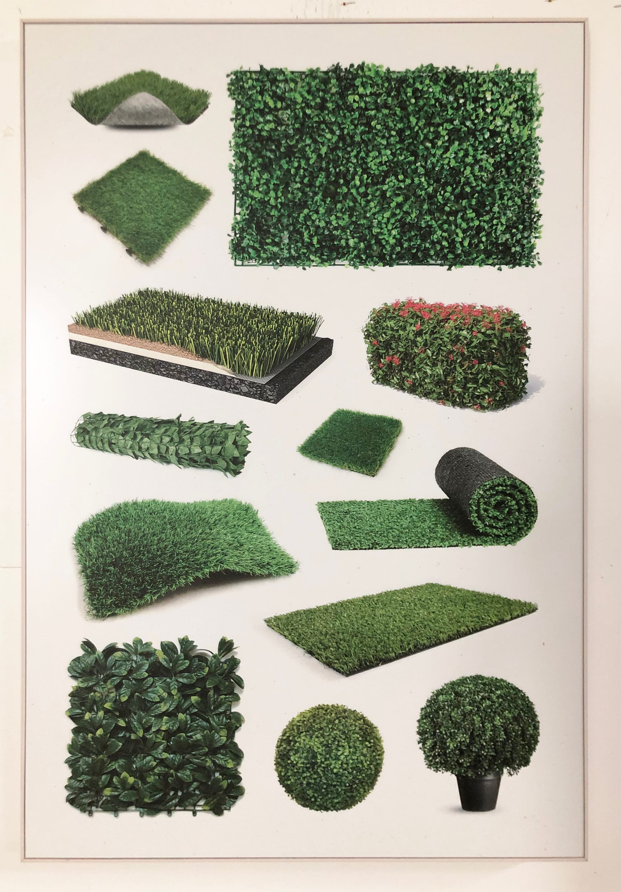 What we are looking at here is a seemingly casual catalogue of mundane green flora — neatly trimmed grass and perfectly shaped topiary. Perhaps from a glossy brochure where suburban gardeners do their shopping on a Sunday afternoon. Upon closer examination, all the greenery is artificial — synthetic nature at its best. We are fooled. This grass and topiary are a lie.