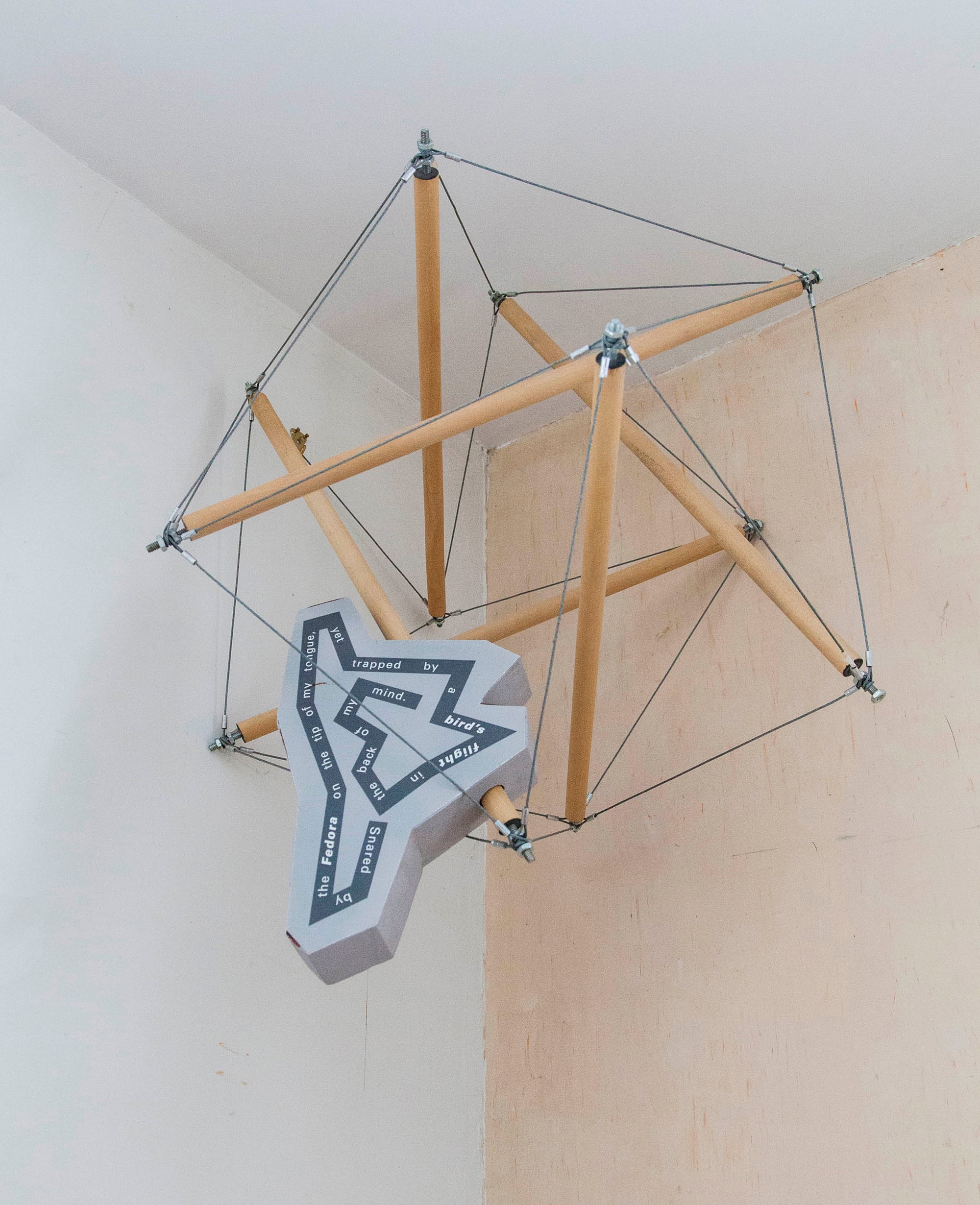Metz’s “snared-trapped Fedora-bird’s flight” is an expanded octahedron tensegrity structure comprising wooden struts and steel cables. Inside, a gray sculpture is positioned, movable along a wooden strut. The sculpture suggests both a wide-brimmed fedora hat and the outline of a bird’s flight. On its flat surface, a darker, zig-zagging band echoes the form’s outer contour and displays white lettering that reads: “Snared by the Fedora on the tip of my tongue, yet trapped by a bird’s flight in the back of my mind.”