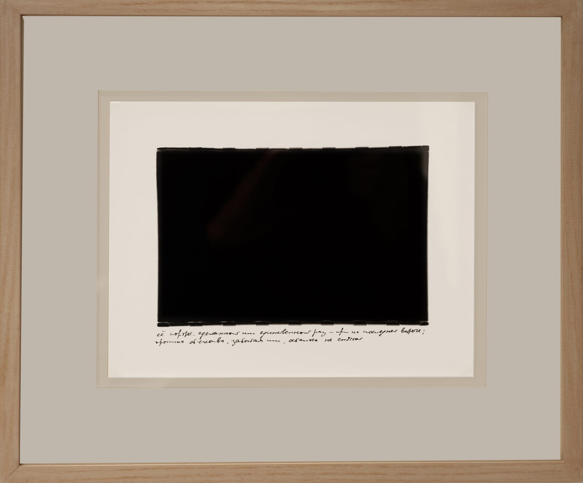 Ellen Carey (Hartford, Connecticut): “Her Portrait Photographed by Him Only One Time – on Their Last Meeting; the Lens Cap, Forgotten by Him, Was Not Taken Off.” This is the English translation of the Russian that Igor Savchenko wrote by hand to caption and title this black rectangle, a photographic print made from a completely transparent 35mm film negative. How many of us have thought we took a picture only to find, once the film was developed, that it had been lost?!