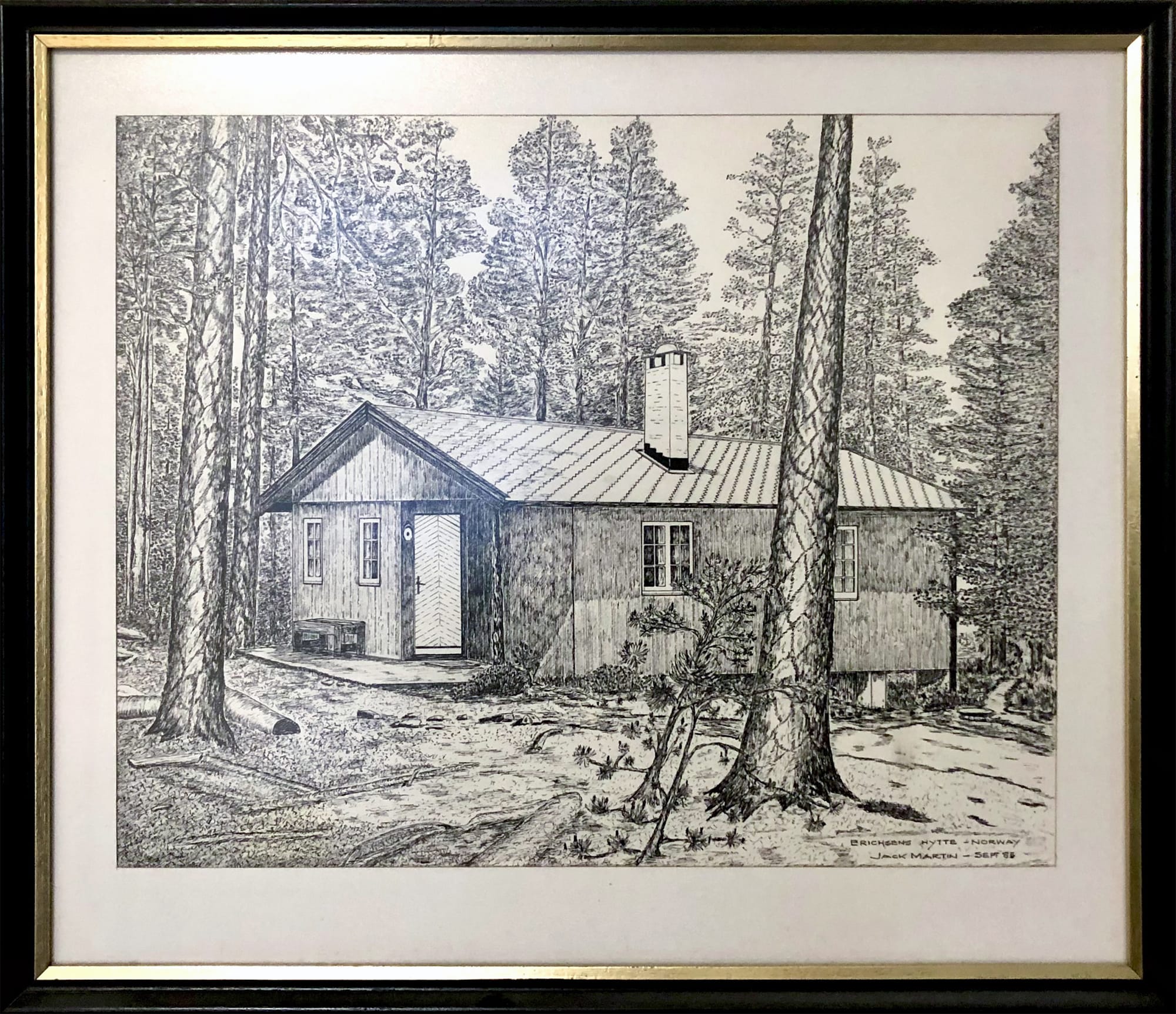 According to family lore, Jack was supposedly so shaped by his experience as a technical draftsman during the war that he was unable to draw freely, having spent so much time making strict schematic drawings during those years. Looking at the beautifully rendered trees surrounding the cabin, I can see that that is not true. They speak of artistic merit, not limitations.