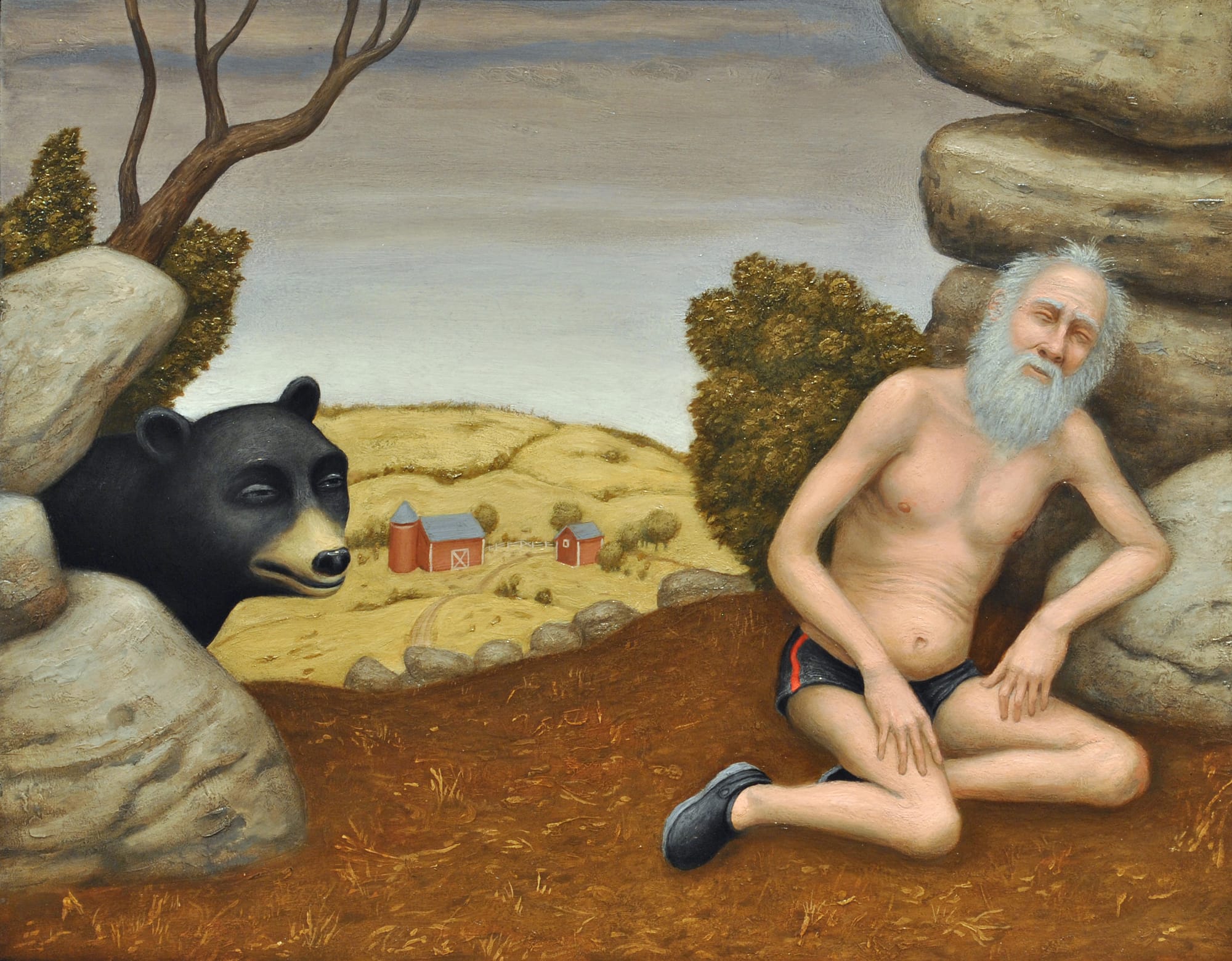 Steve Greene (Collinsville, Connecticut): My wife and I bought “Asleep Near Litchfield”by our good friend Seth Forman in 2015. I love this little painting. It is a little more whimsical than usual for Seth, and not as disturbing. A black bear, his eyes squinting in ecstasy like a happy pet, spies on a Rip Van Winkle-like character. If not for the hirsute hermit’s Crocs and running shorts, this might be a lost painting from the Renaissance, with its stylized boulders straight from Giotto, the distant idyllic farm, the careful layers of glazes. The figures, rocks, trees and sky interlock in a very satisfying way.
